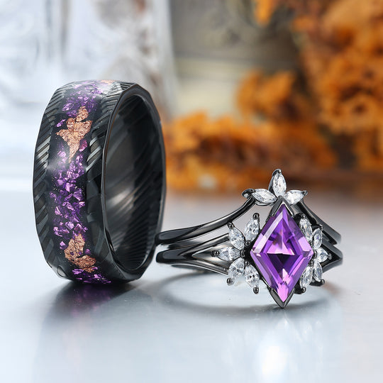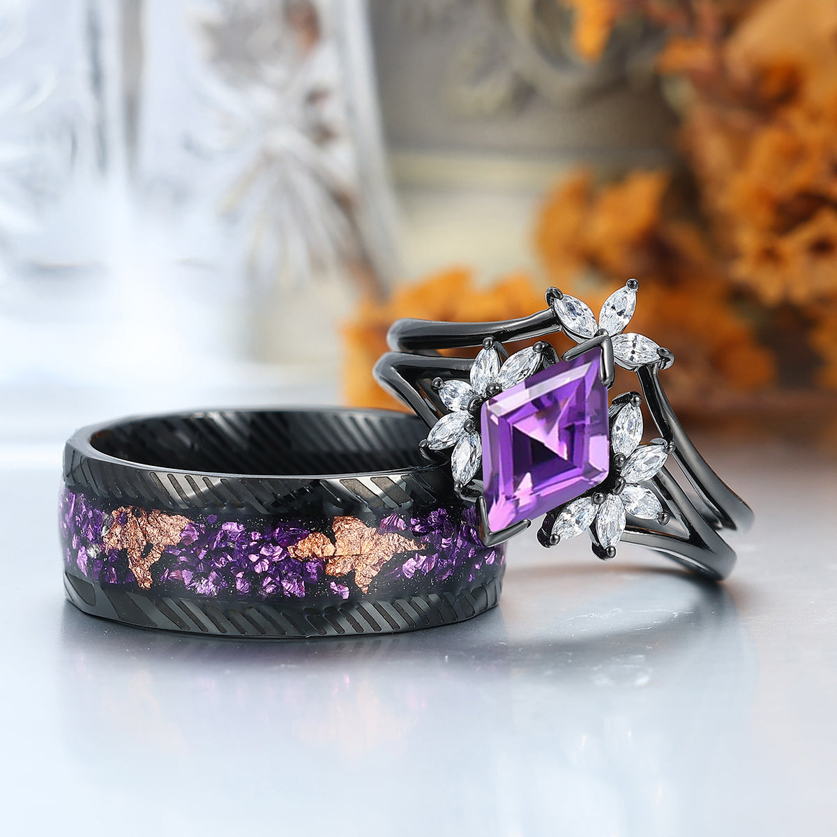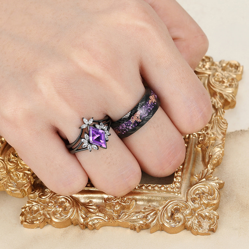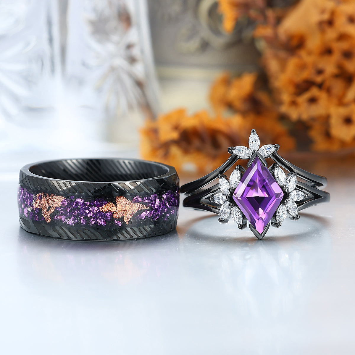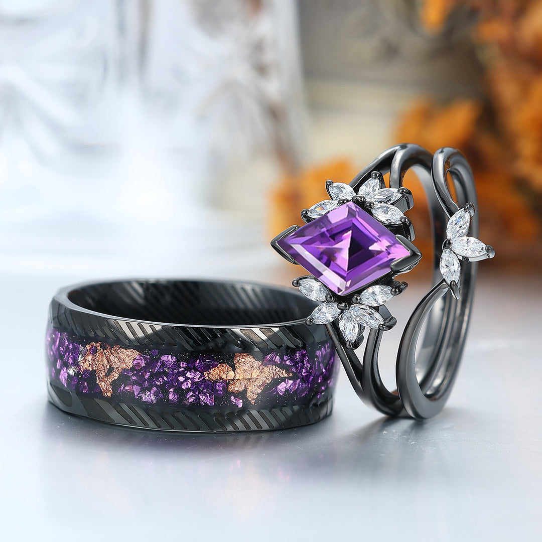 Delicate Amethyst Petal Engagement Couple Rings Set Matching Promise Purple Damascus Steel Wedding Band -  Esdomera.com