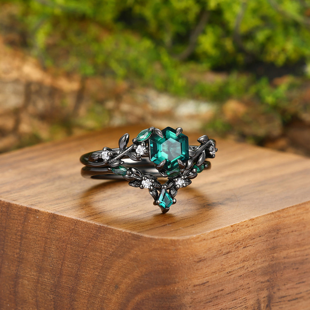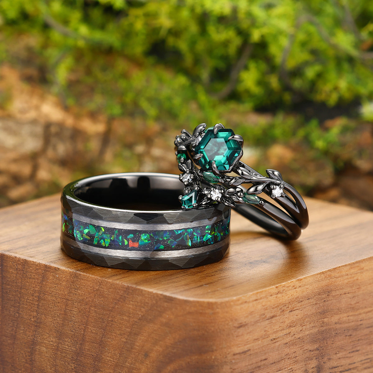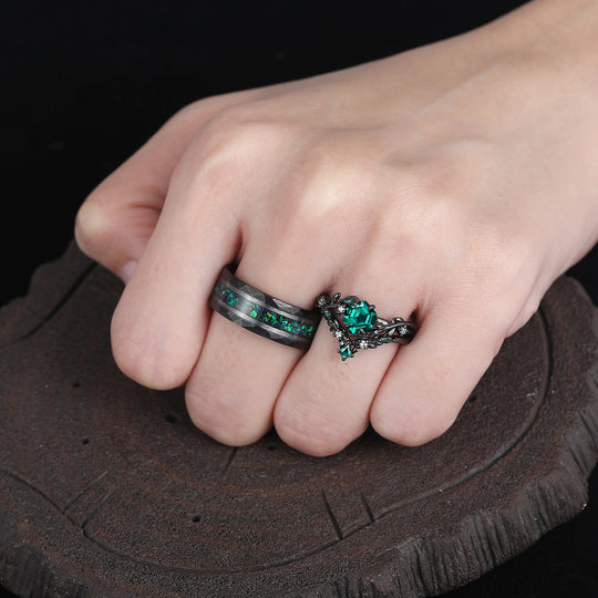 Delicate Emerald Sprig Shape Engagement Couple Rings Set Black Tungsten Personalized Anniversary Rings.