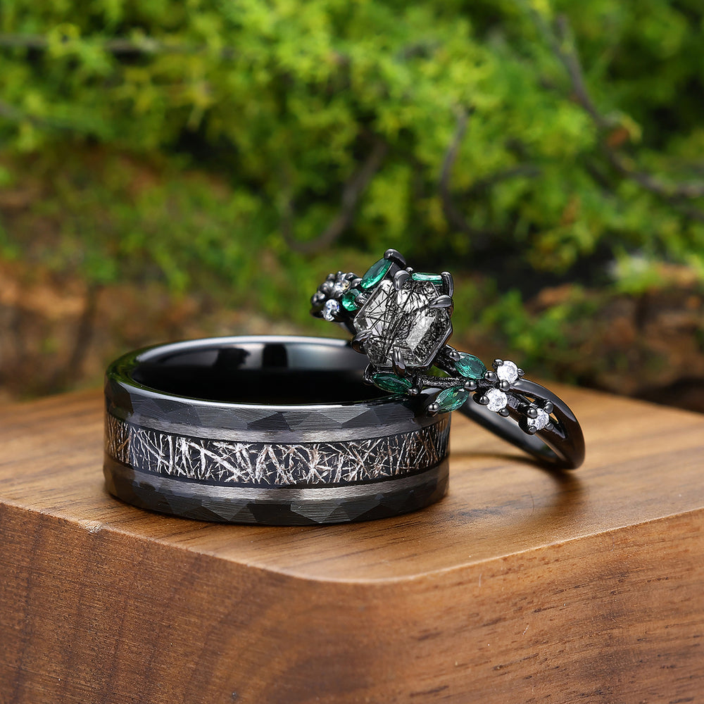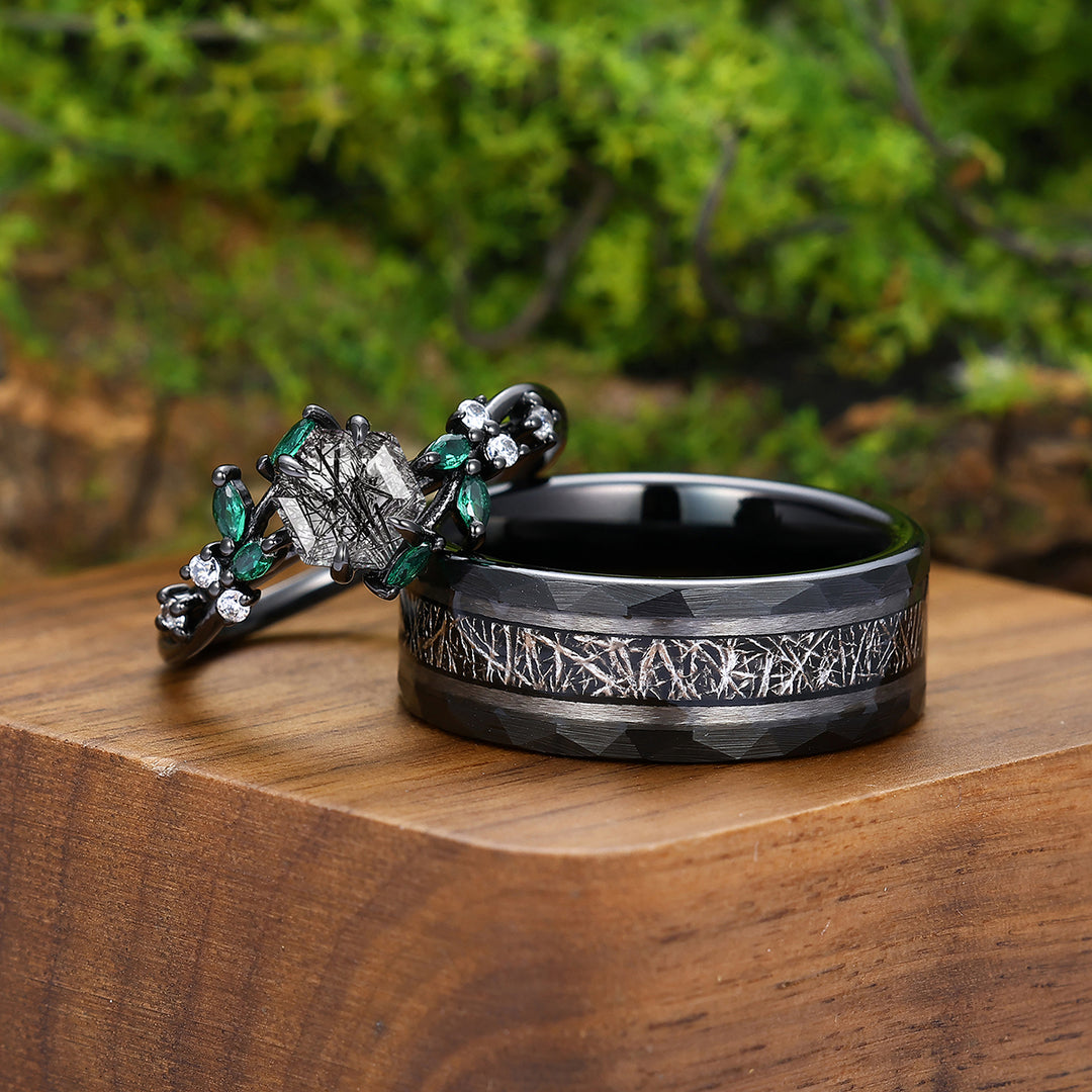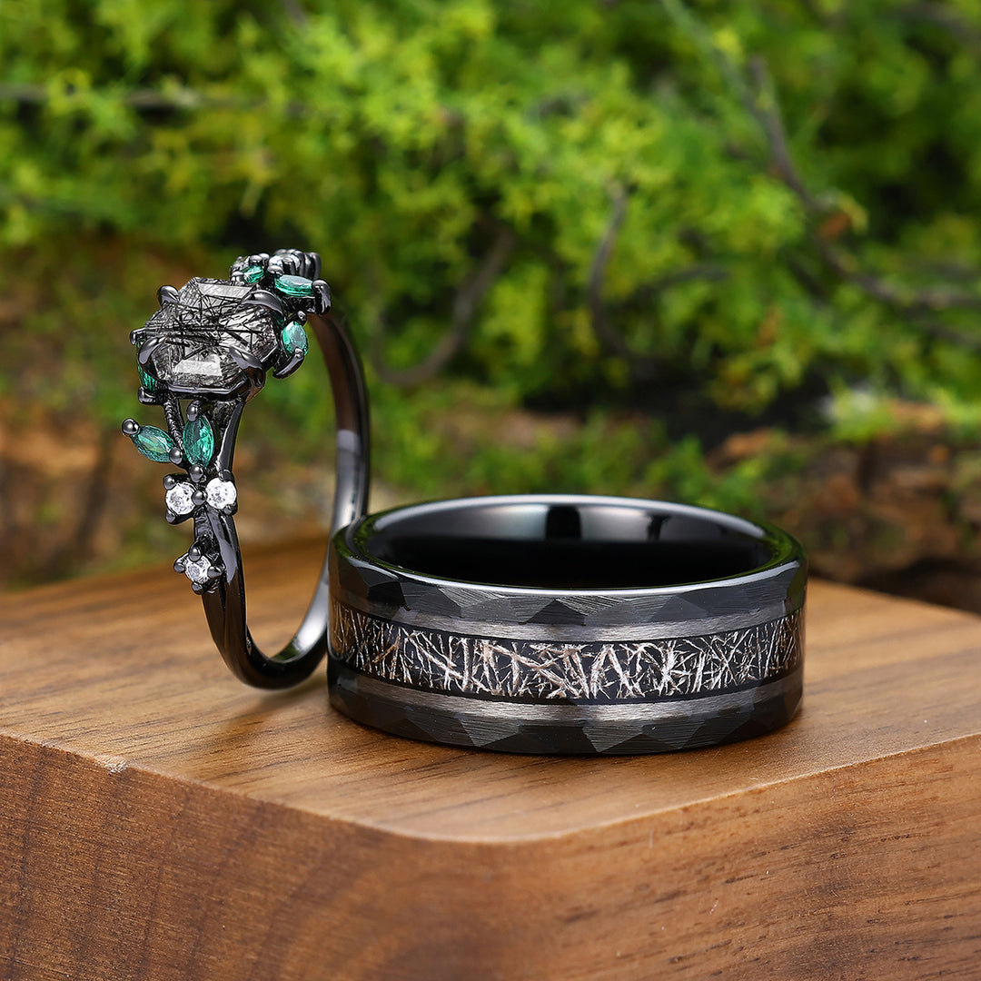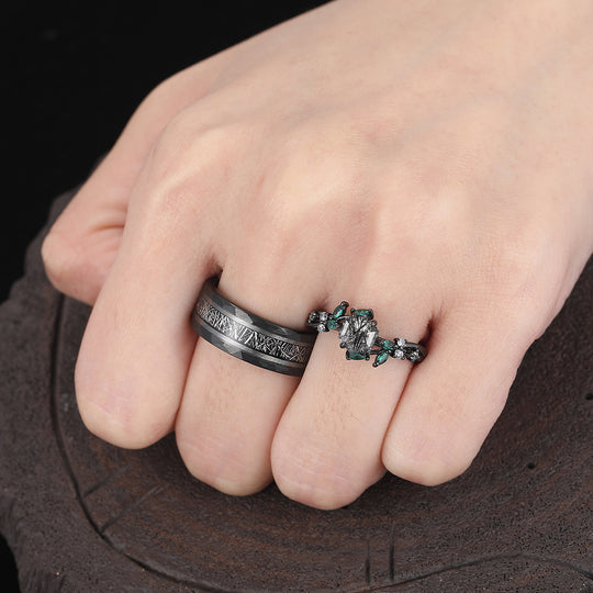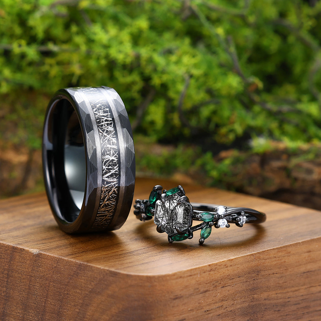 Delicate Natural Black Rutilated Quartz Engagement Rings For Couples Personalized Couples' Set