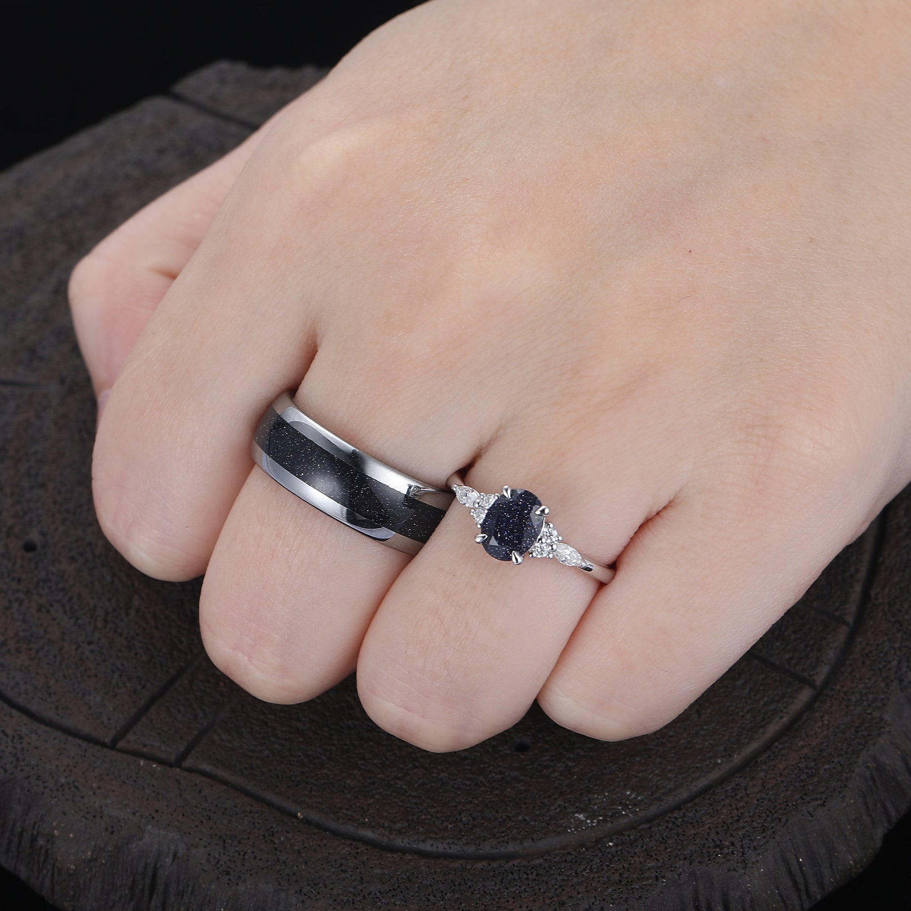 Exquisite Oval Blue Sandstone Accents Engagement Couples Ring Set His And Hers Wedding Bands Marriage Rings