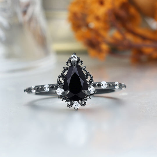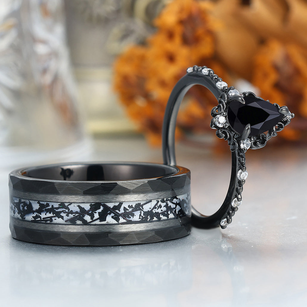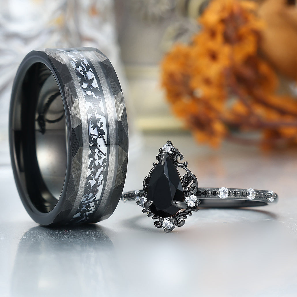 Filigreed Natural Black Onyx Engagement Rings For Couples Modern Hammered Anniversary Wedding Band