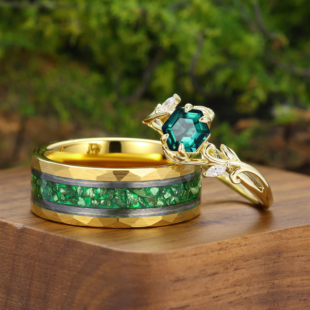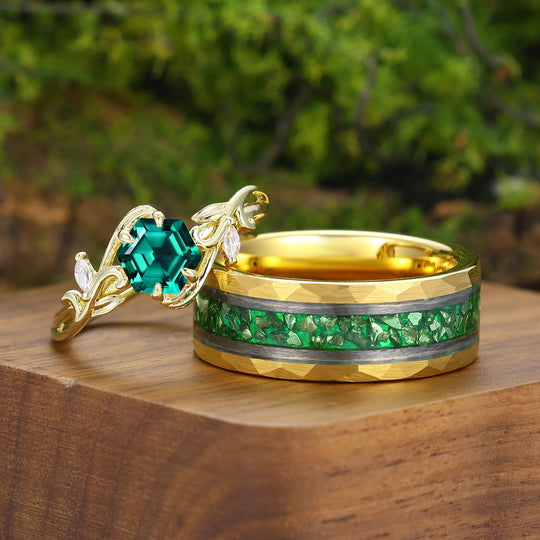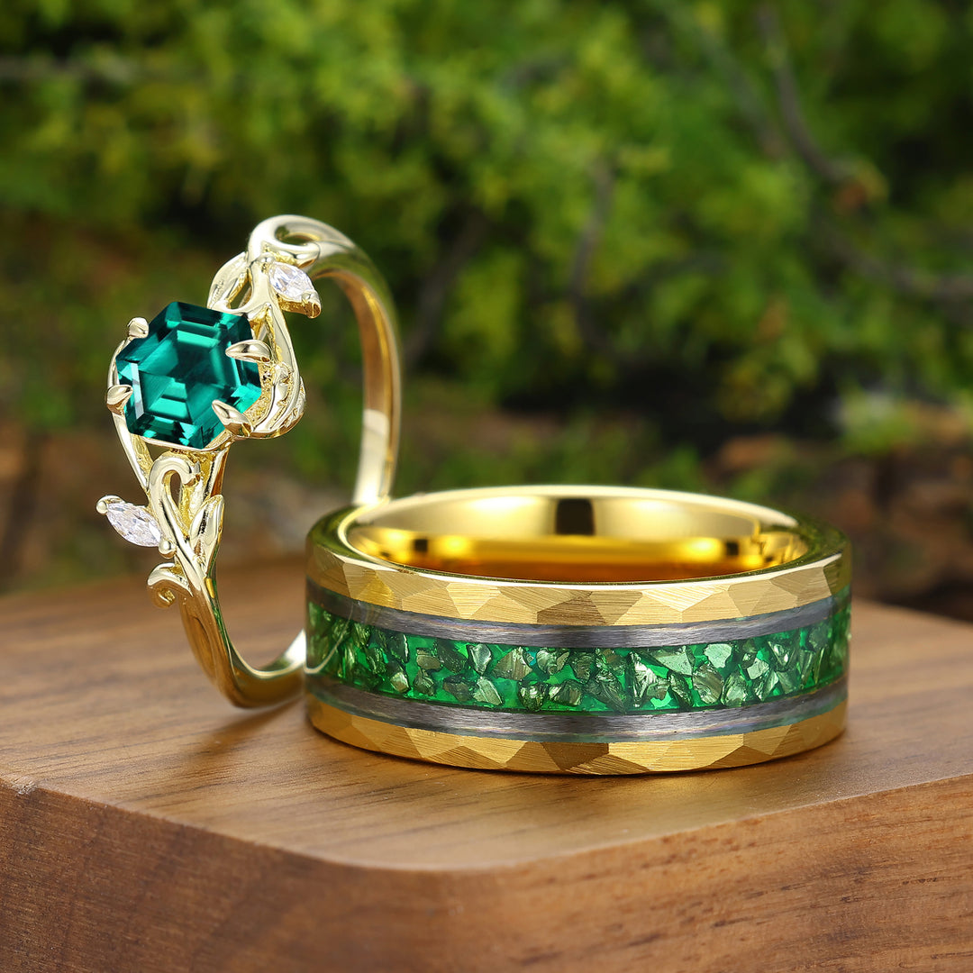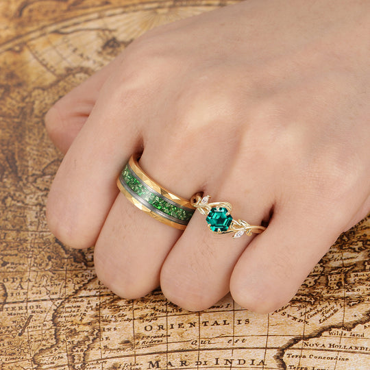Green Emerald Leaf Branch Matching Ring For Men And Women 2pcs Couple Ring Set