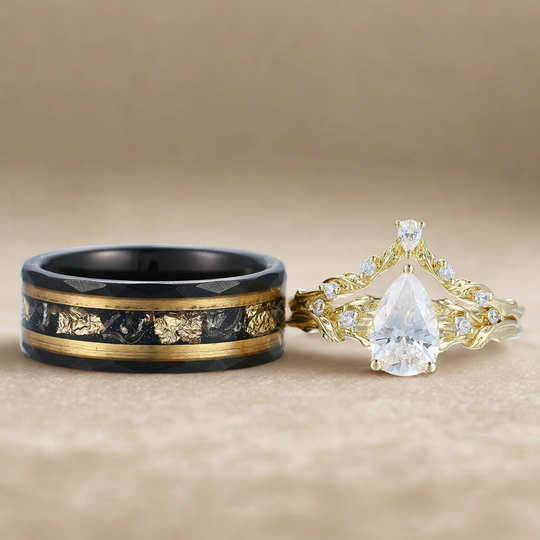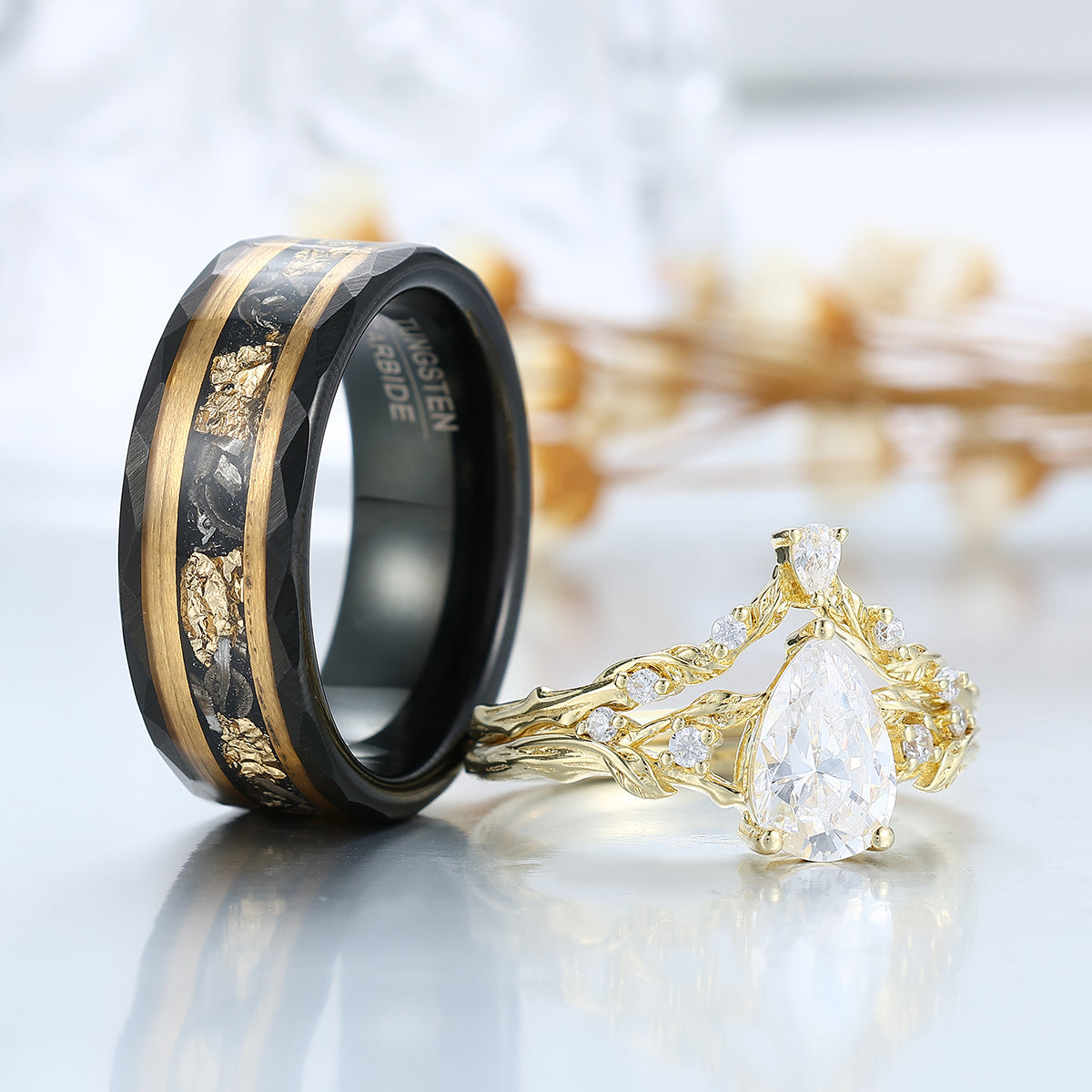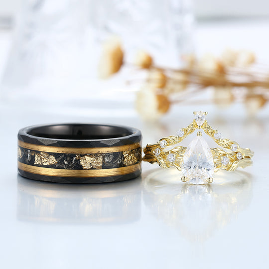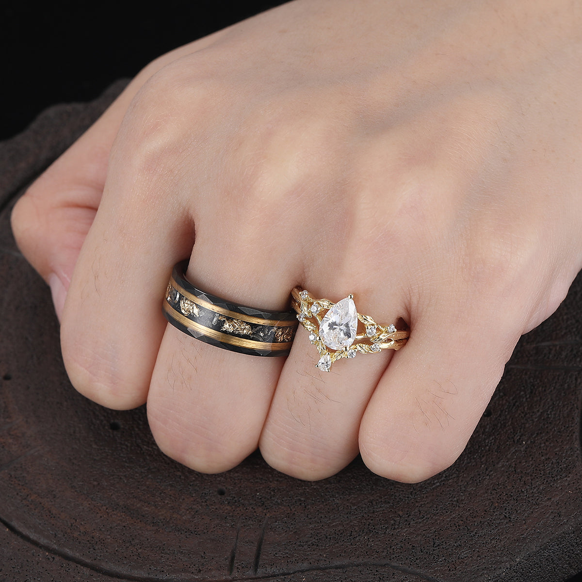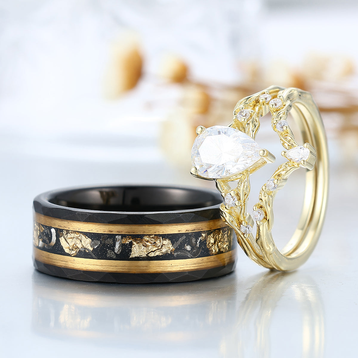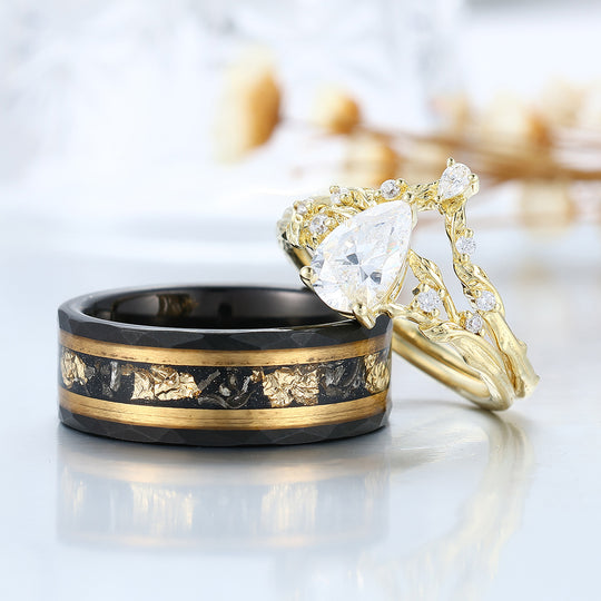 Leaf Branch Design Moissanite Couple Ring Set Yellow Gold Plated His And Hers Marriage Rings
