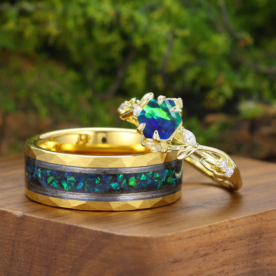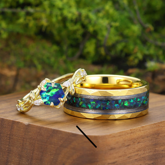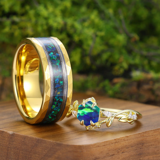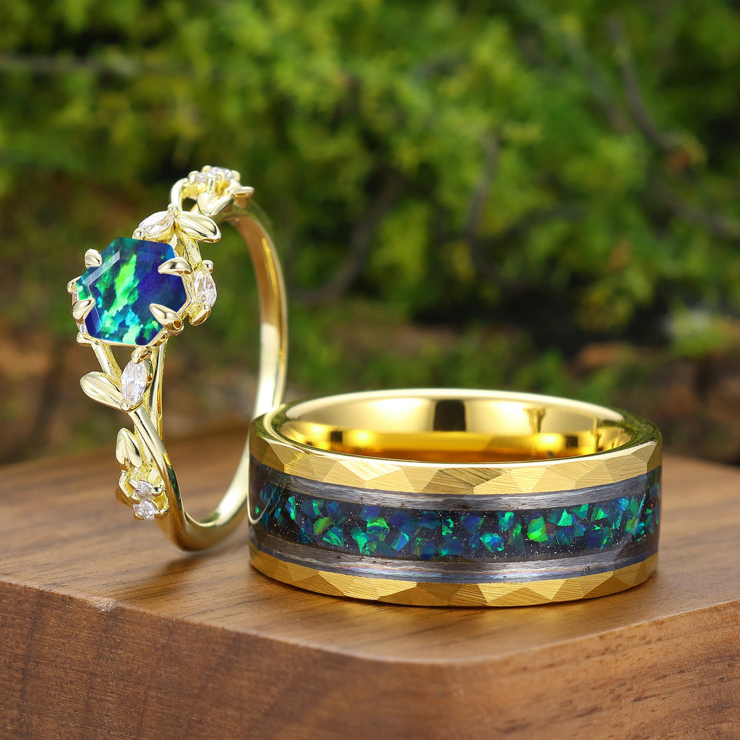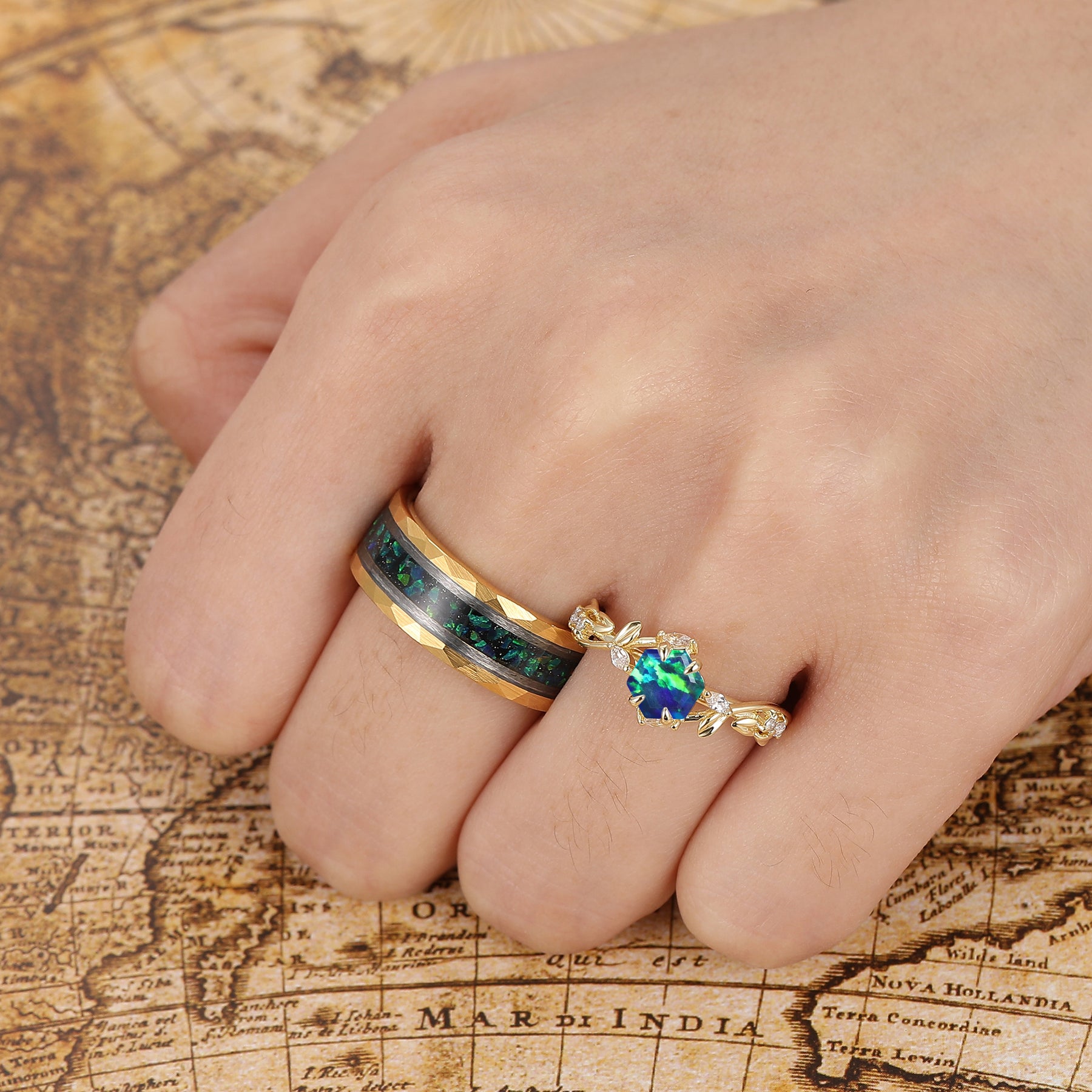 Leaf Design Peacock Green Opal Matching His And Hers Ring Green Blue Couples Ring