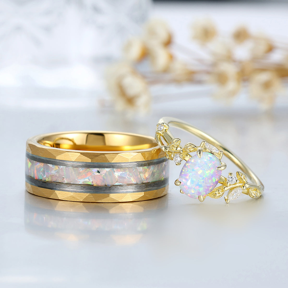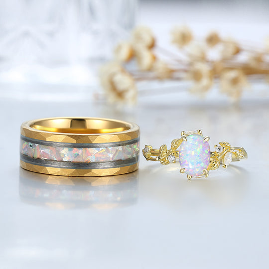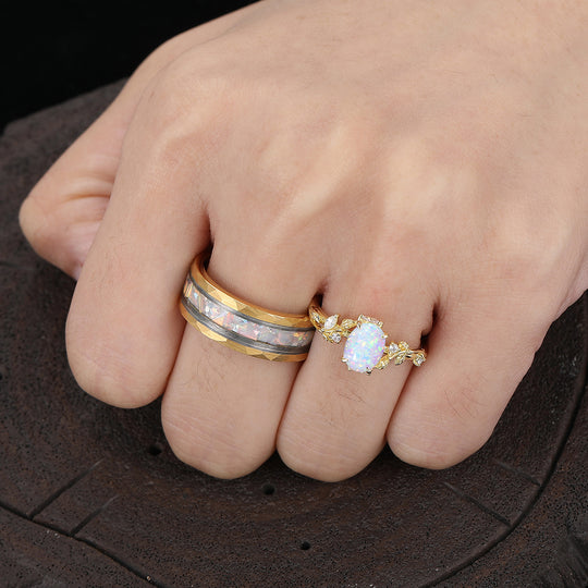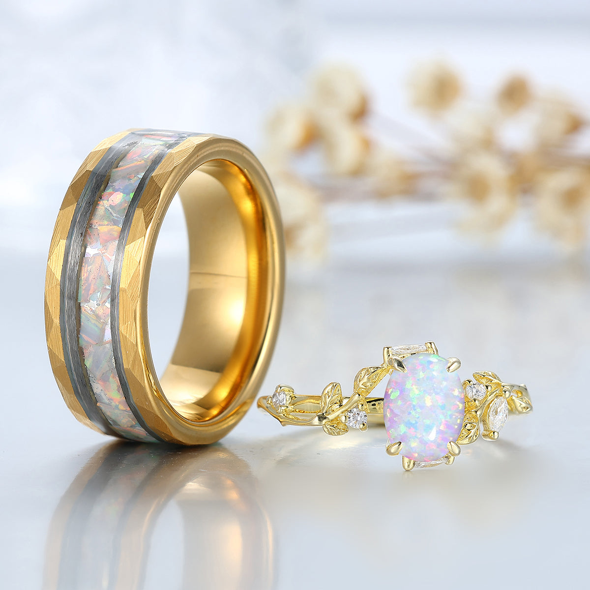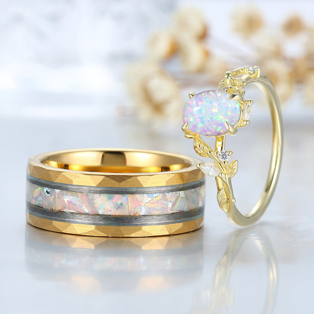 Leaf-inspired Pink White Opal Couple Rings Yellow Gold Plated Matching Ring For Him And Her