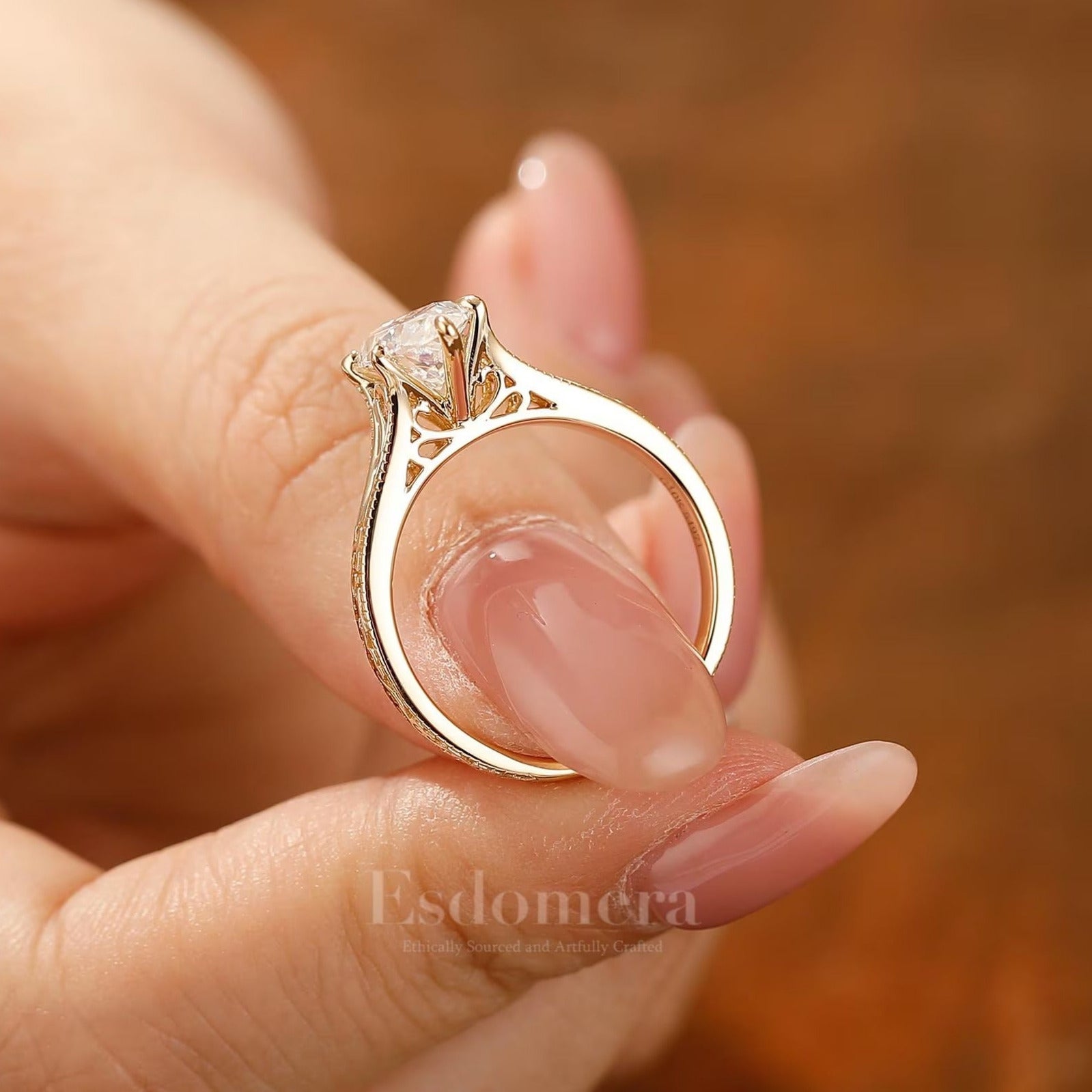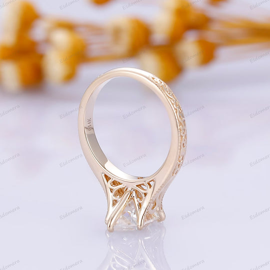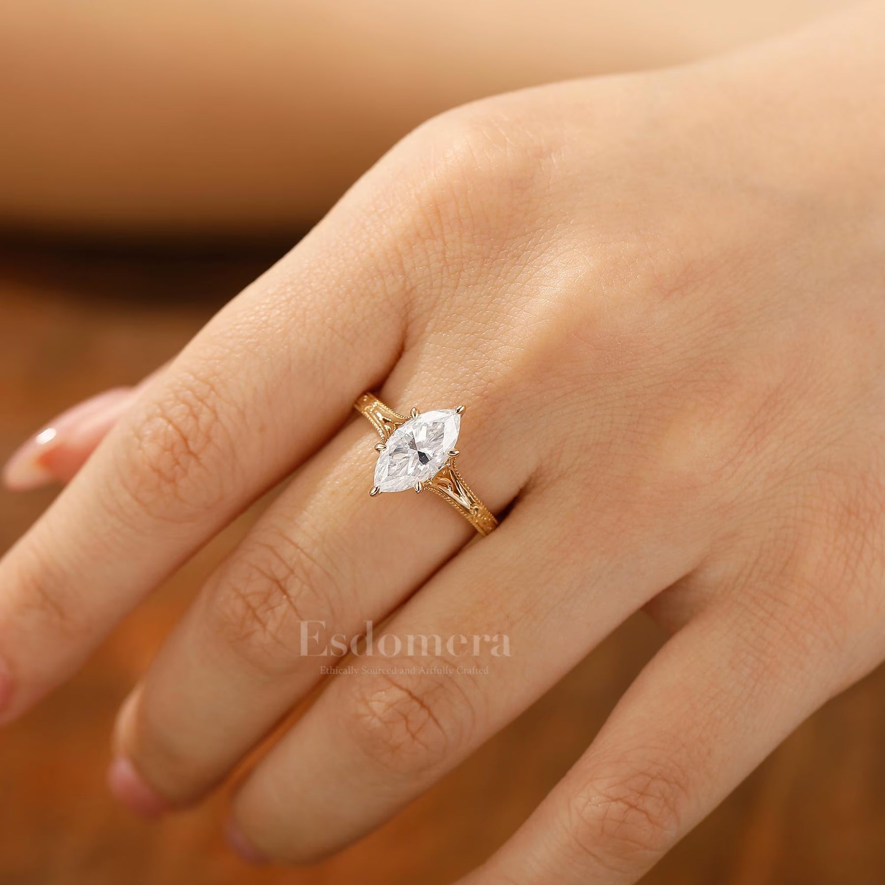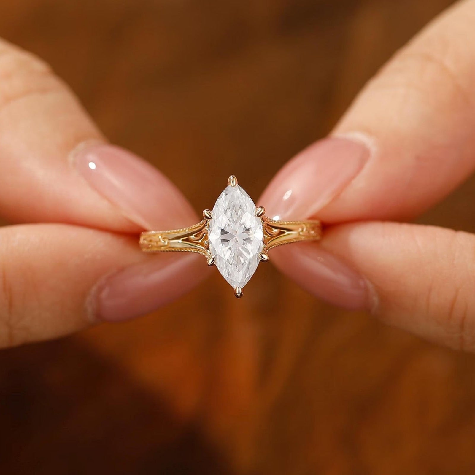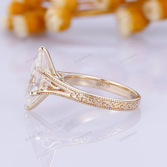 Marquise Cut Solitaire Moissanite Ring Solid Gold Filigree Wedding Ring 6 Prongs Women Ring