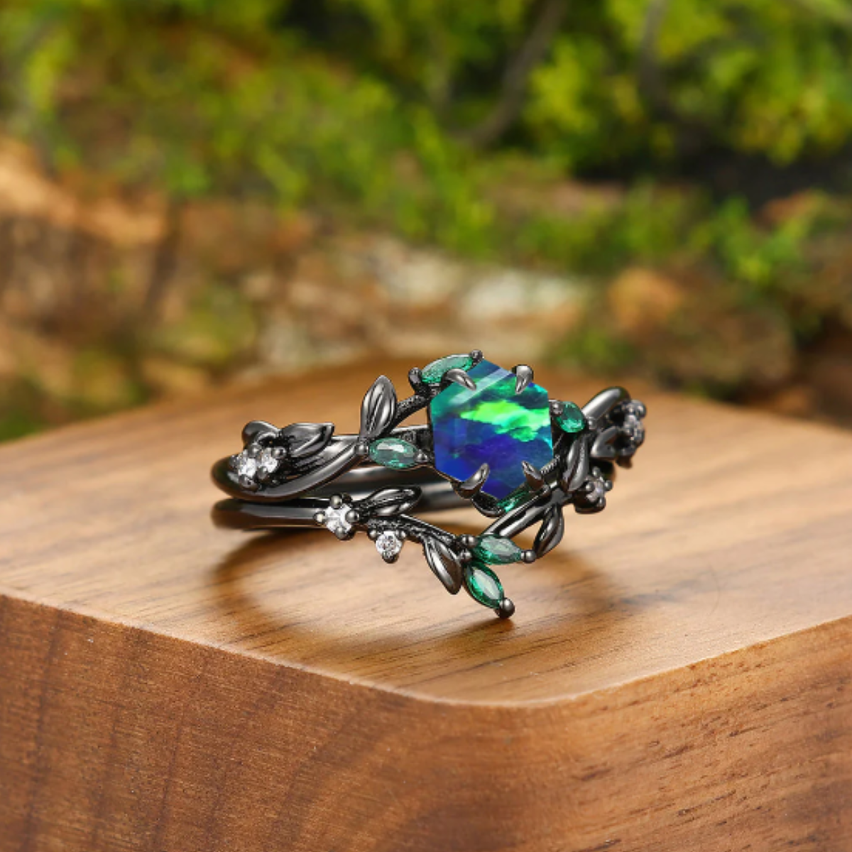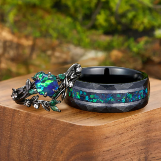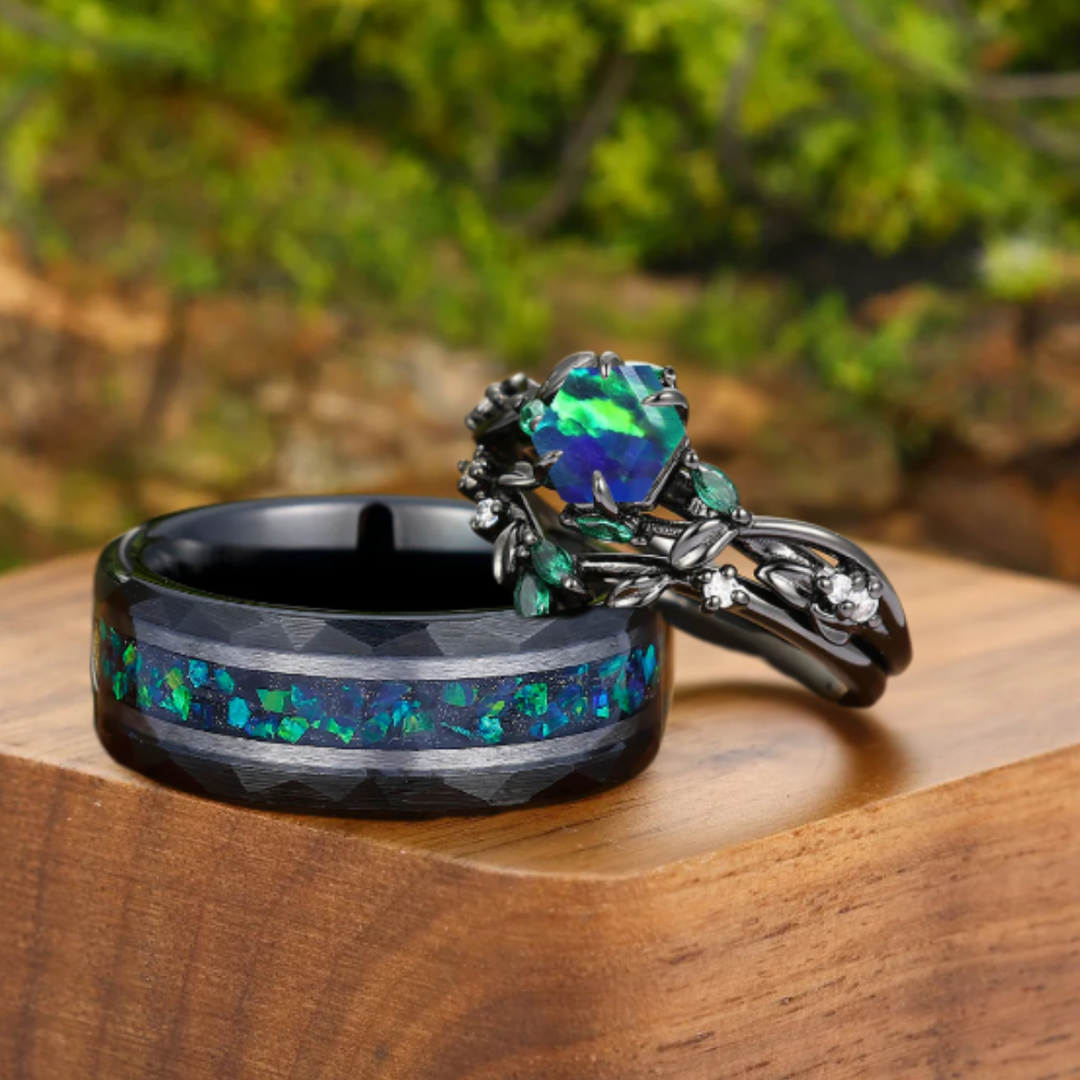 Nature-inspired Design Peacock Green Opal Sprig Engagement Rings Set For Couples Matching Tungsten Promise Rings Couples Set
