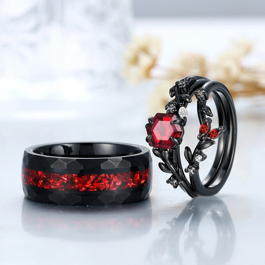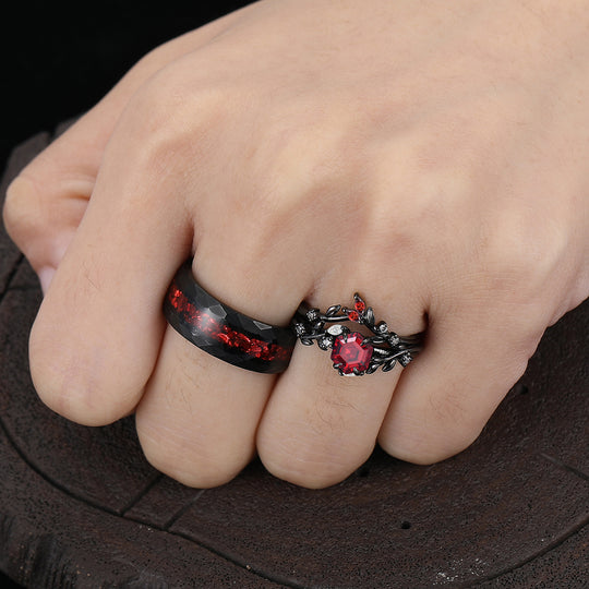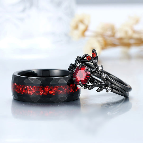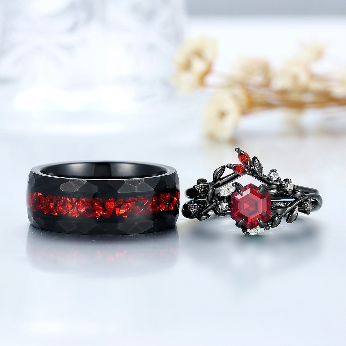 Nature Inspired Red Garnet Couple Ring Set Leaf Style Red And Black 3 Piece His and Hers Wedding Ring Sets