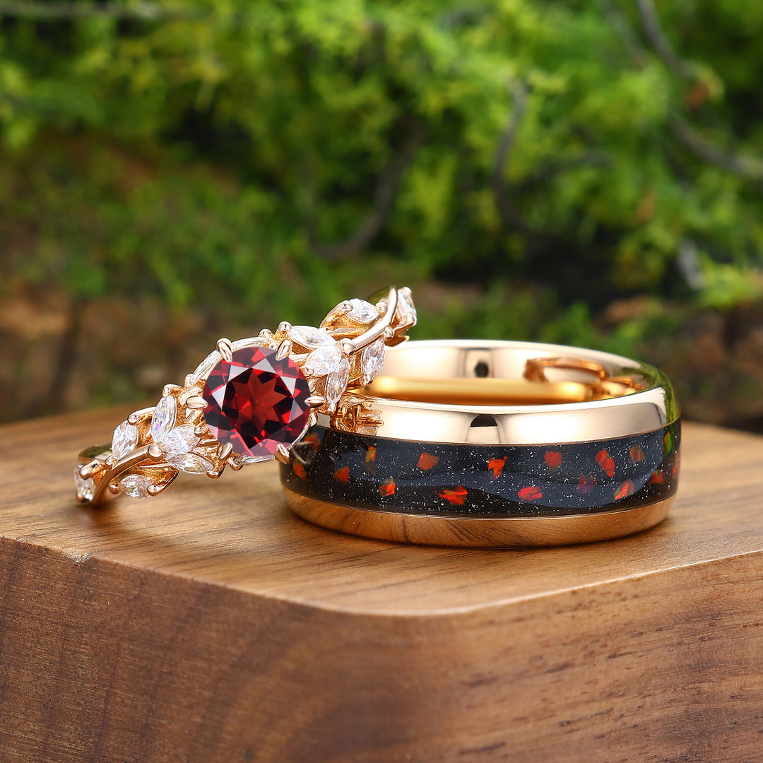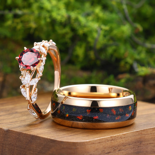 Nature Inspired Round Red Garnet Couples Ring Matching Red Garnet Rose Gold Plated Ring