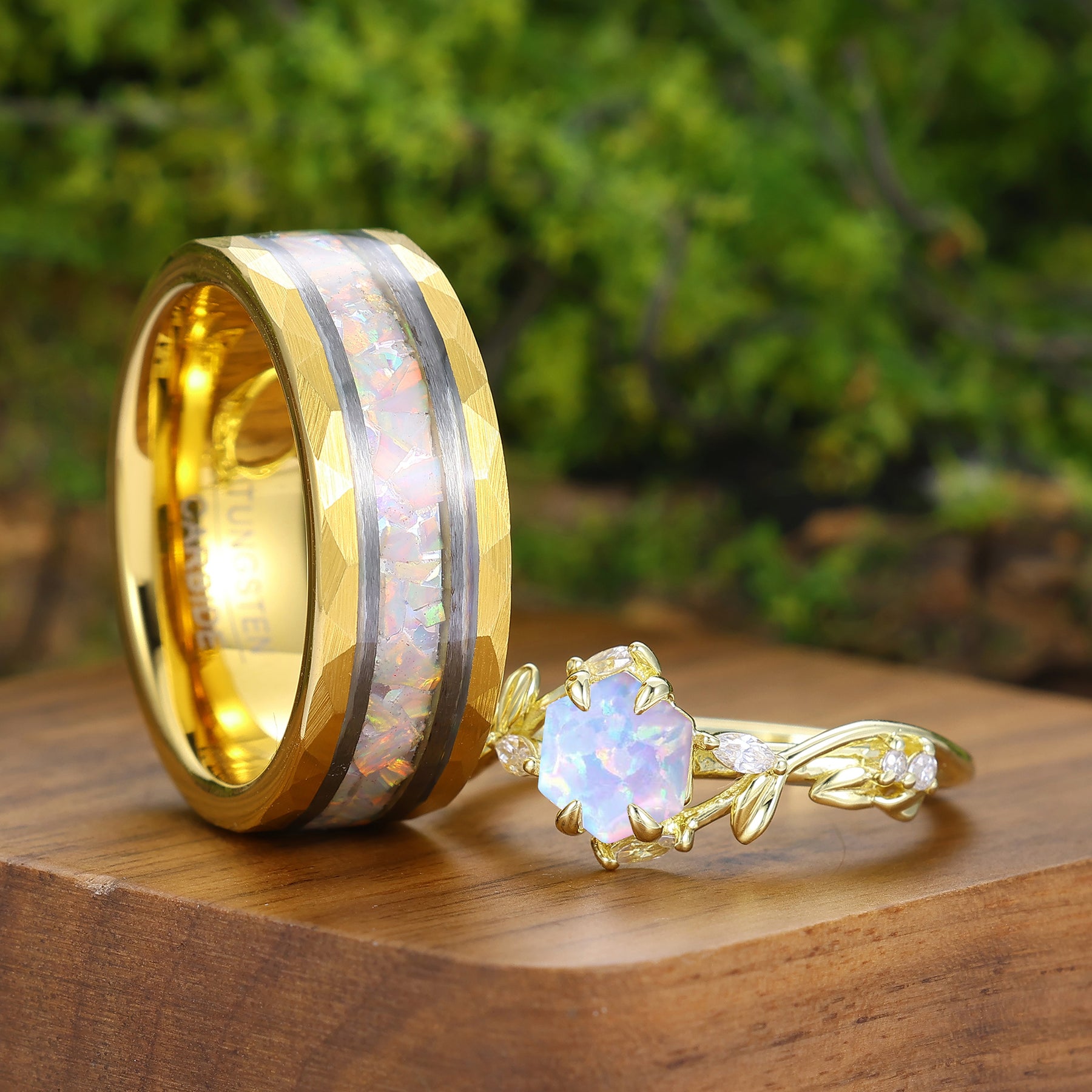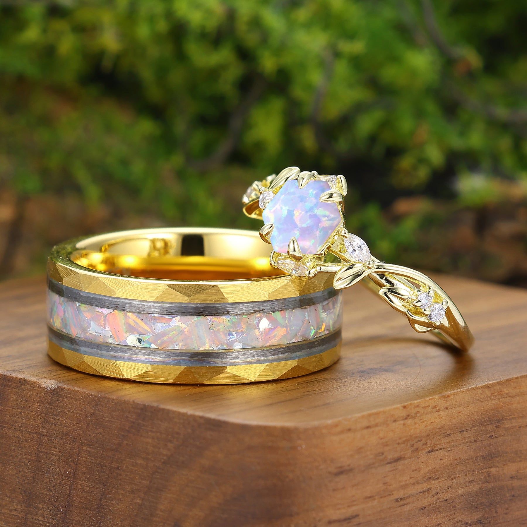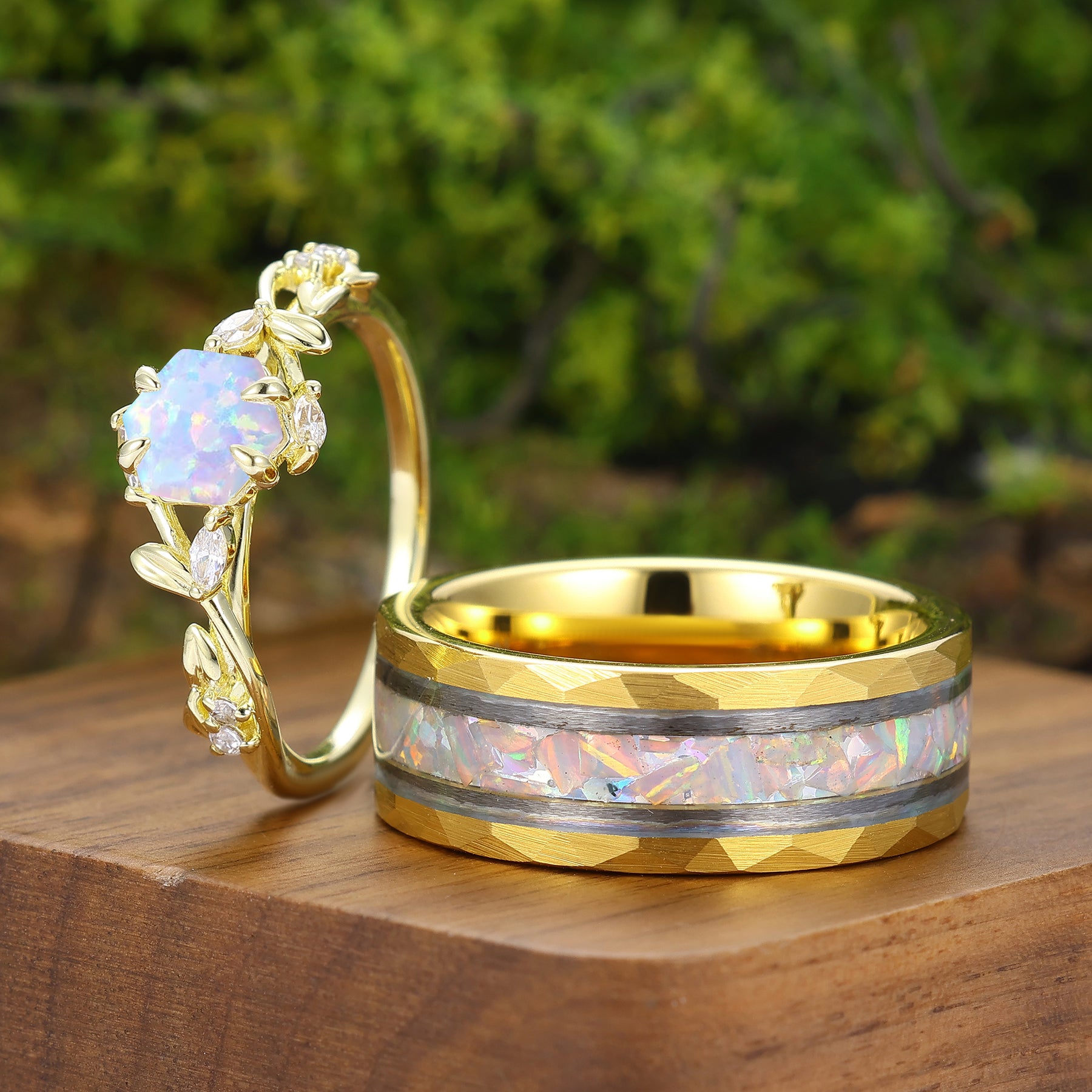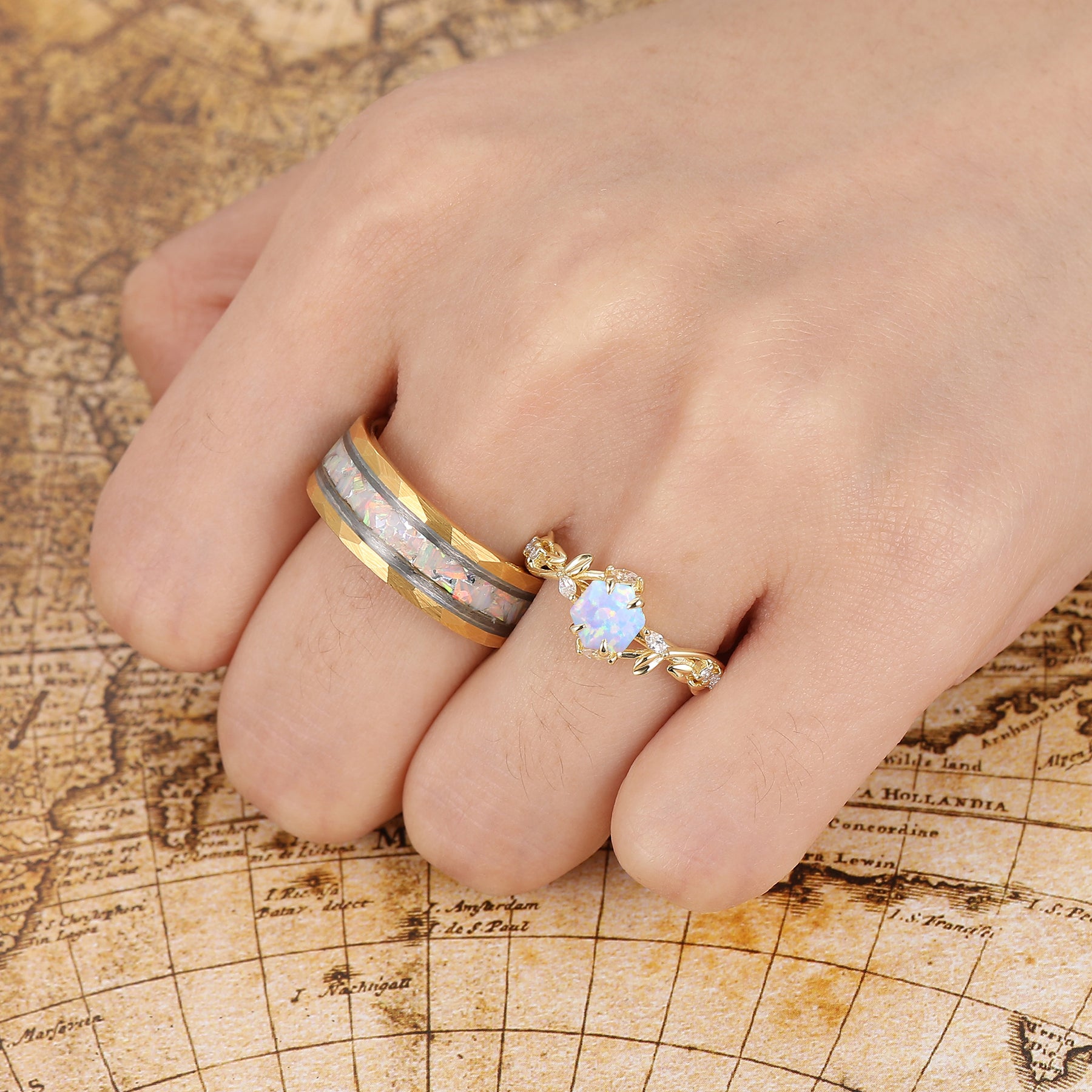 Pink White Opal Leaf Couples Ring Set Promise His And Hers Ring 2pcs Wedding Band