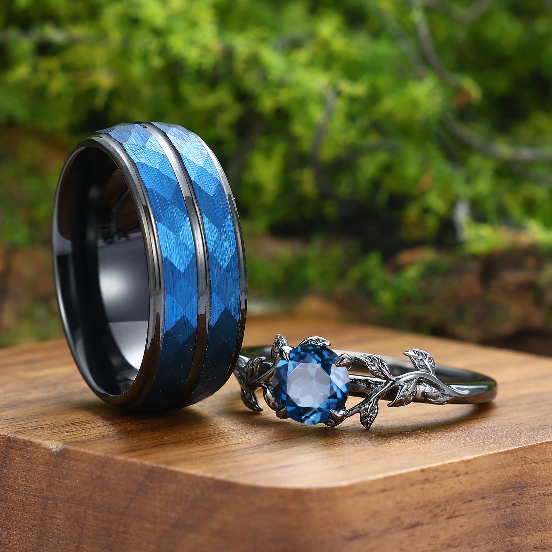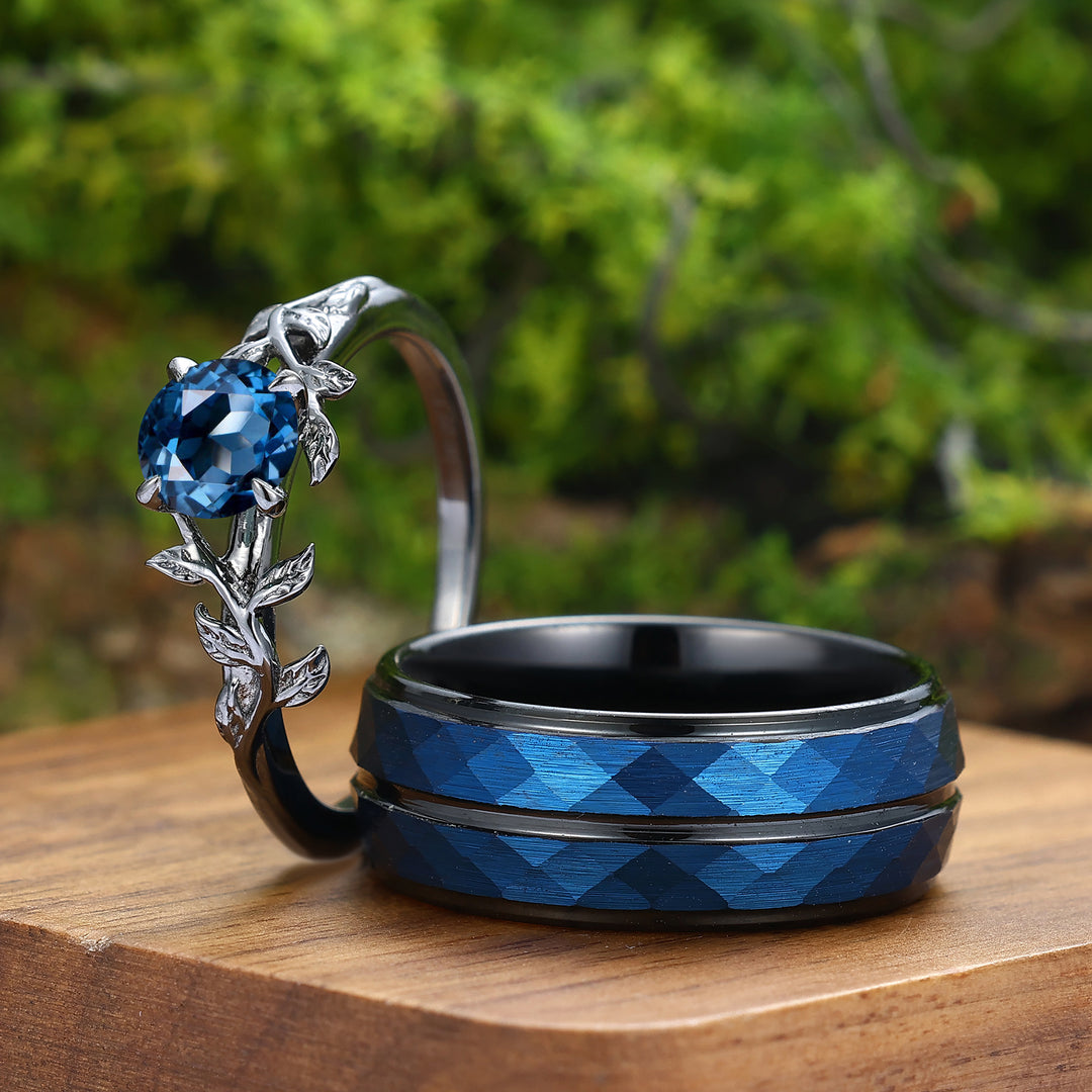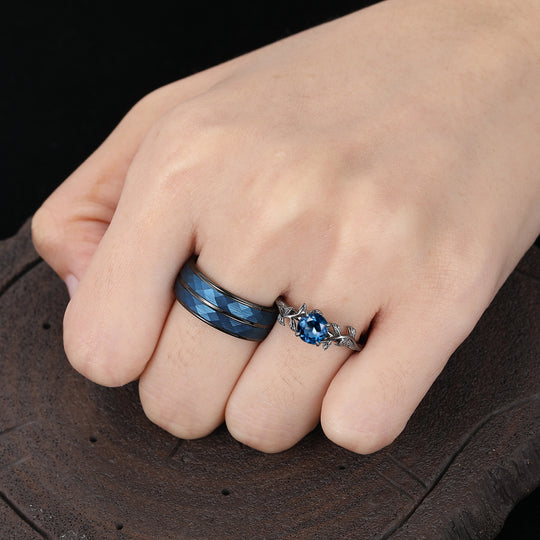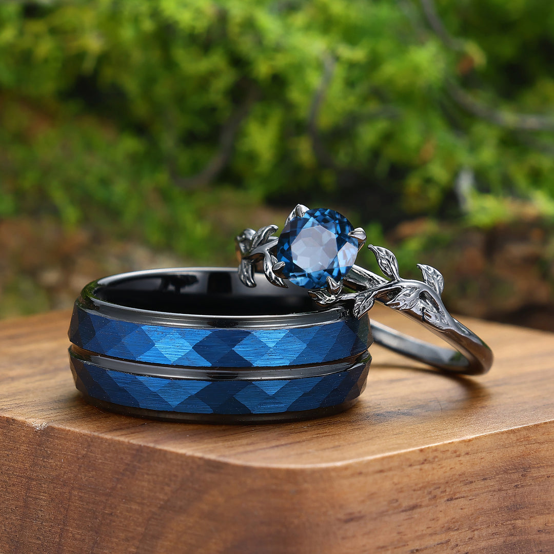 Solitaire Nature Inspired London Blue Topaz Twig His And Hers Matching Ring Couple Ring Set