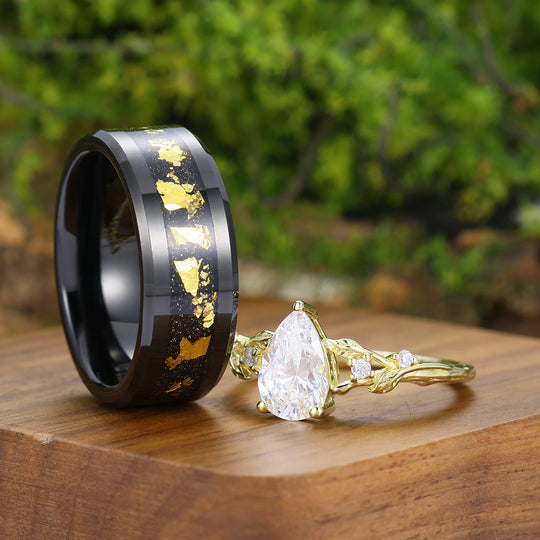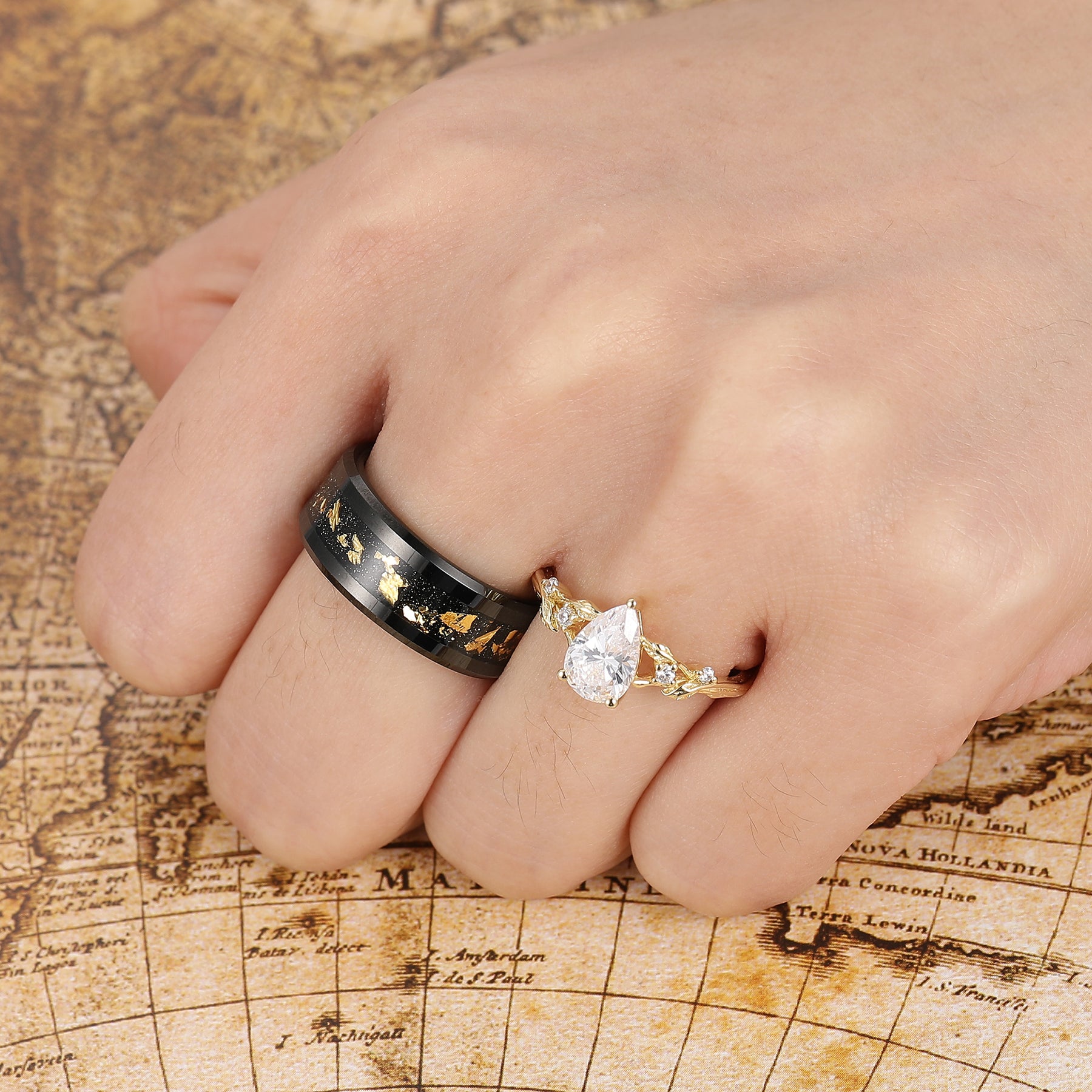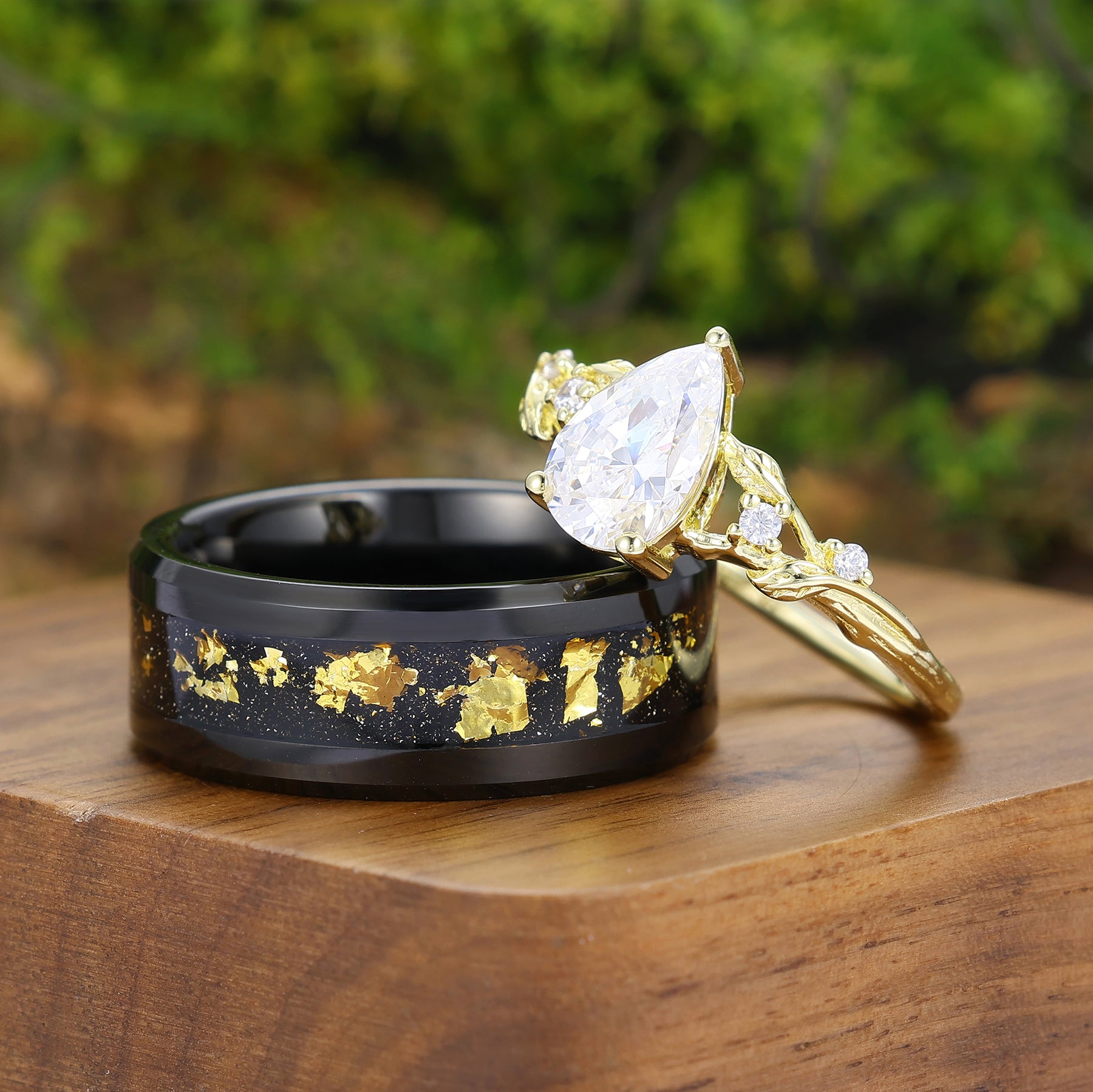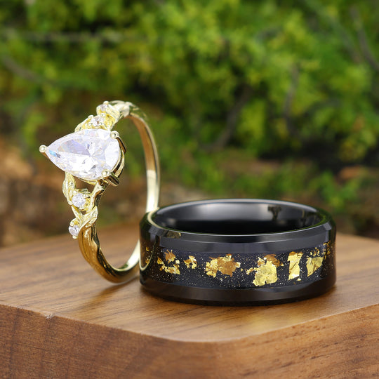 Stylish Moissanite Stem Matching Ring Set Unique Yellow Gold Plated Couple Rings