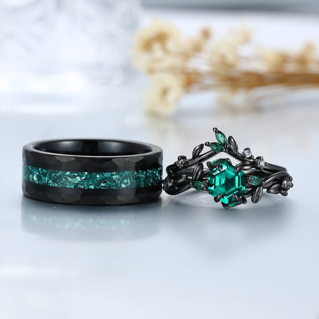 Twig Leaf-inspired Green Emerald Couple Rings Emerald Black Plated His And Hers Ring Set