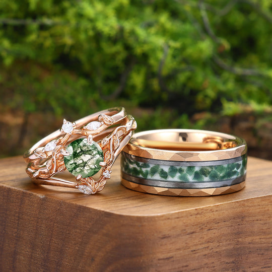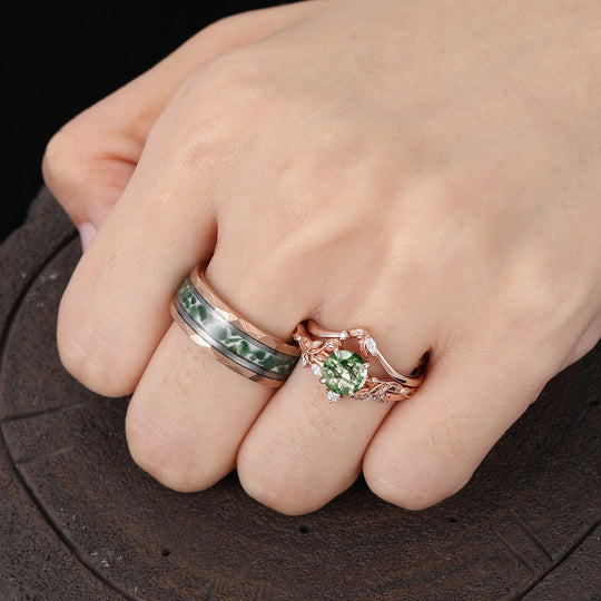 Unique 1.25CT Round Moss Agate Leaf Couples Ring Set 4pcs Moss Agate Band For Men And Women