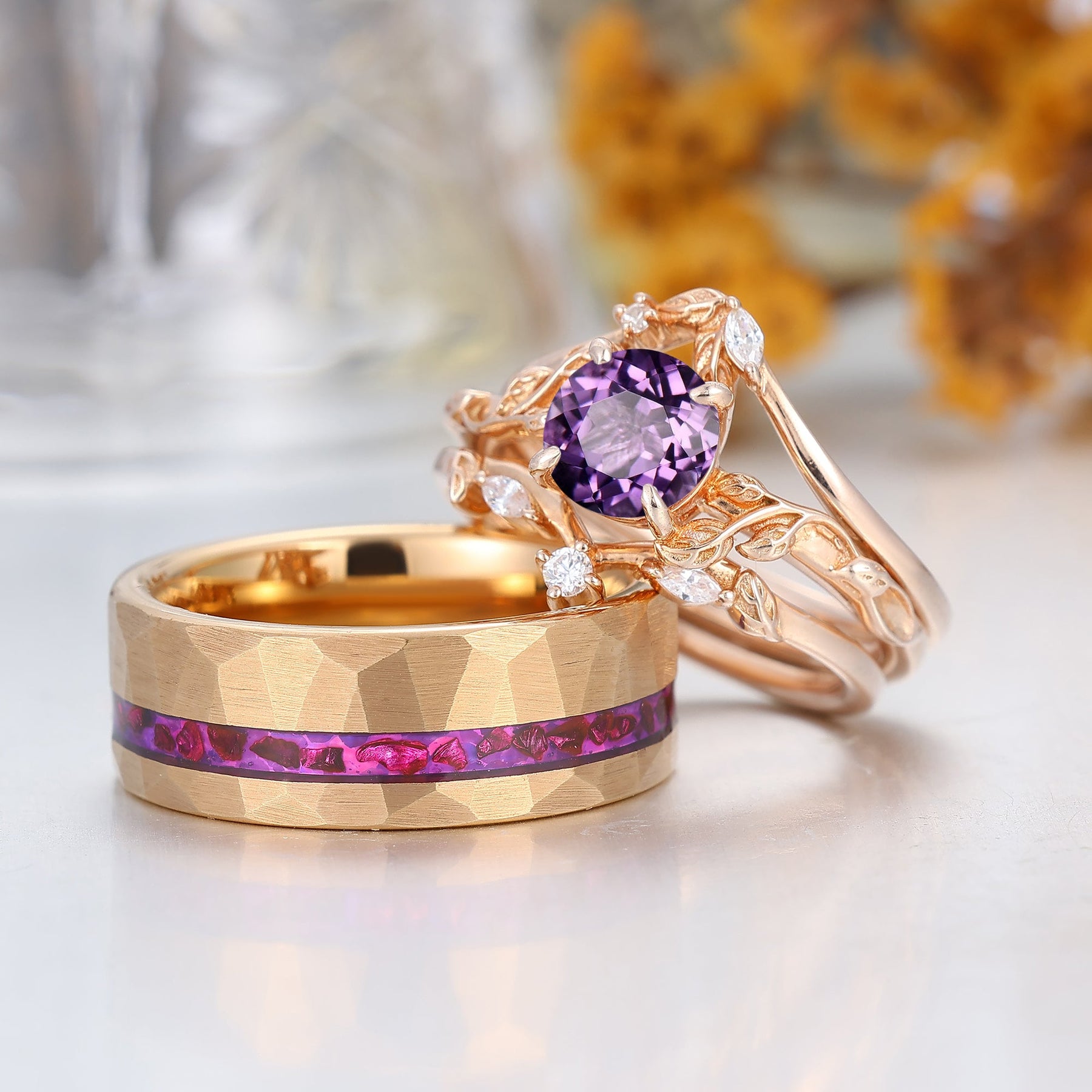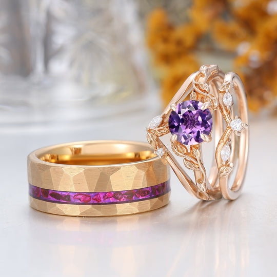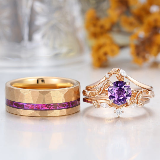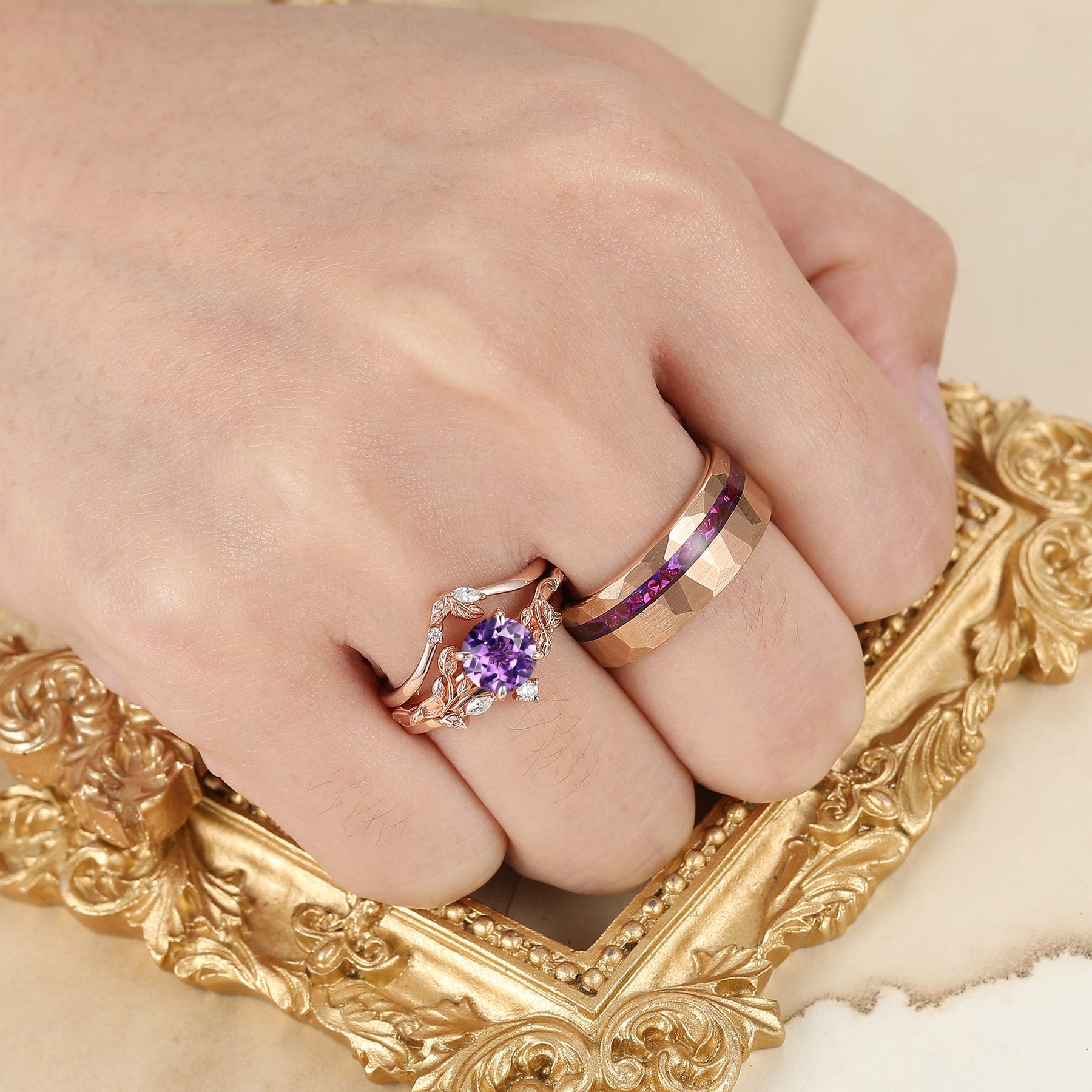 Vine Leaf Design Natural Purple Amethyst Couples Ring S925 And Tungsten His And Hers Rings