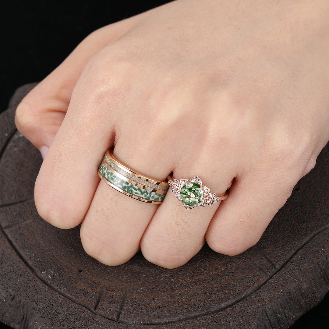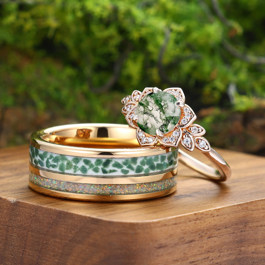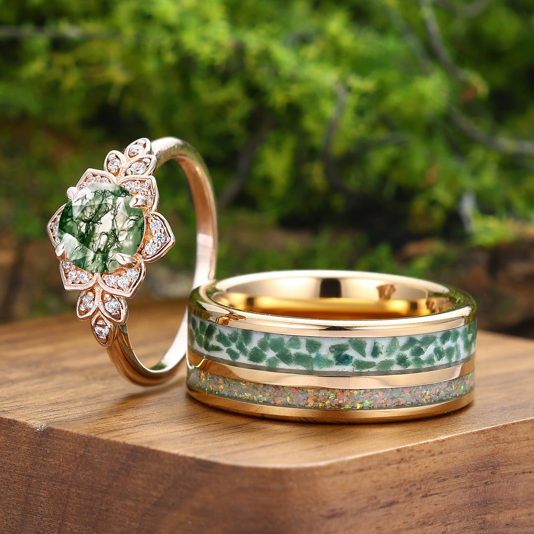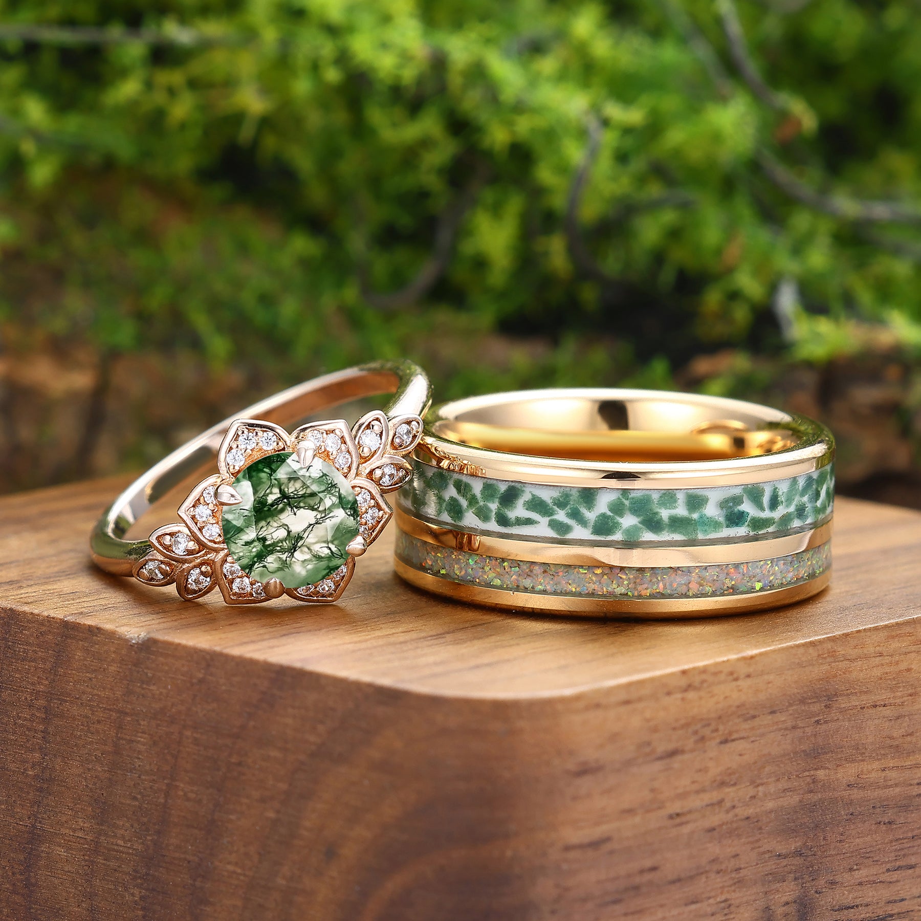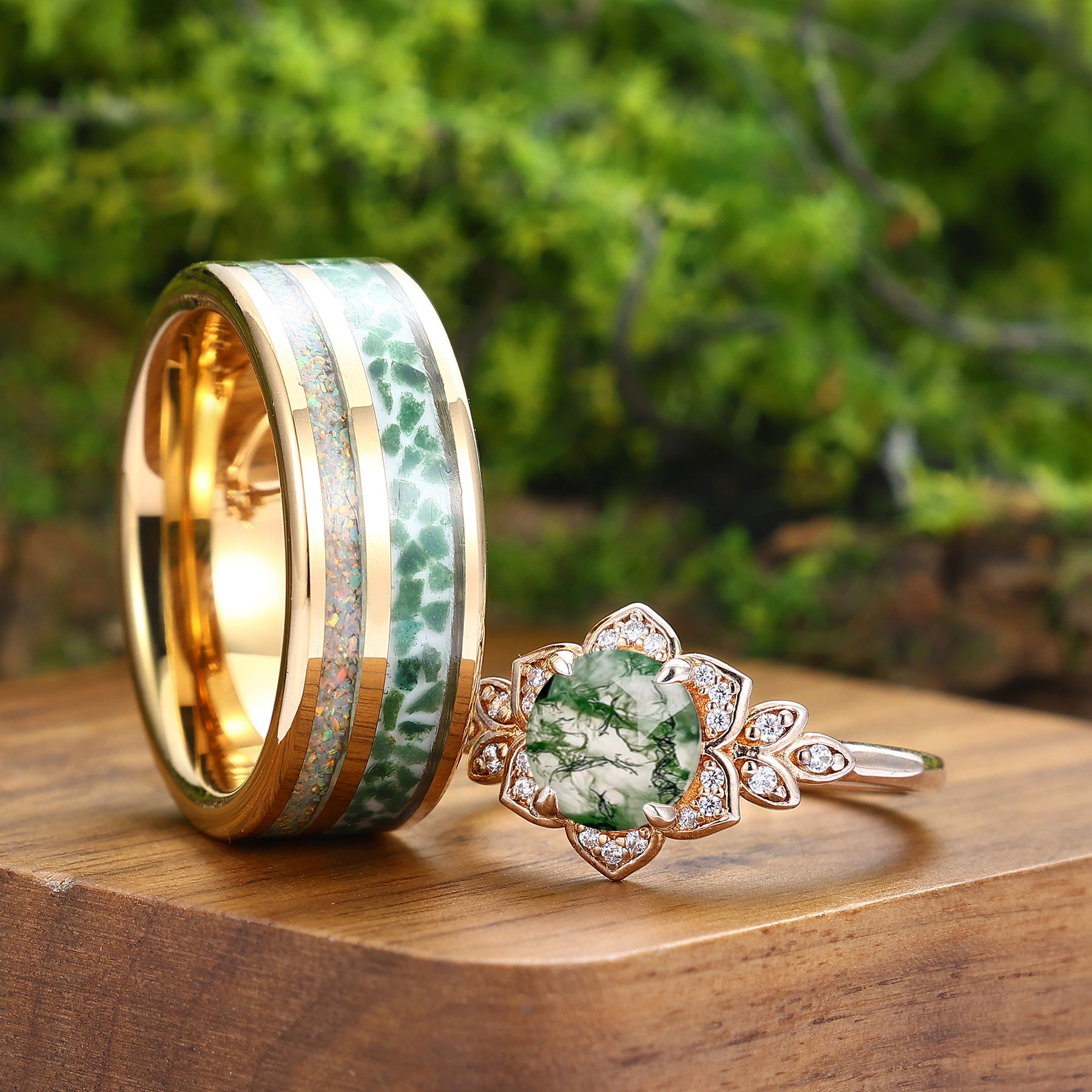 Vintage Floral Shape Round Moss Agate His And Hers Ring Green Moss Agate Couples ring