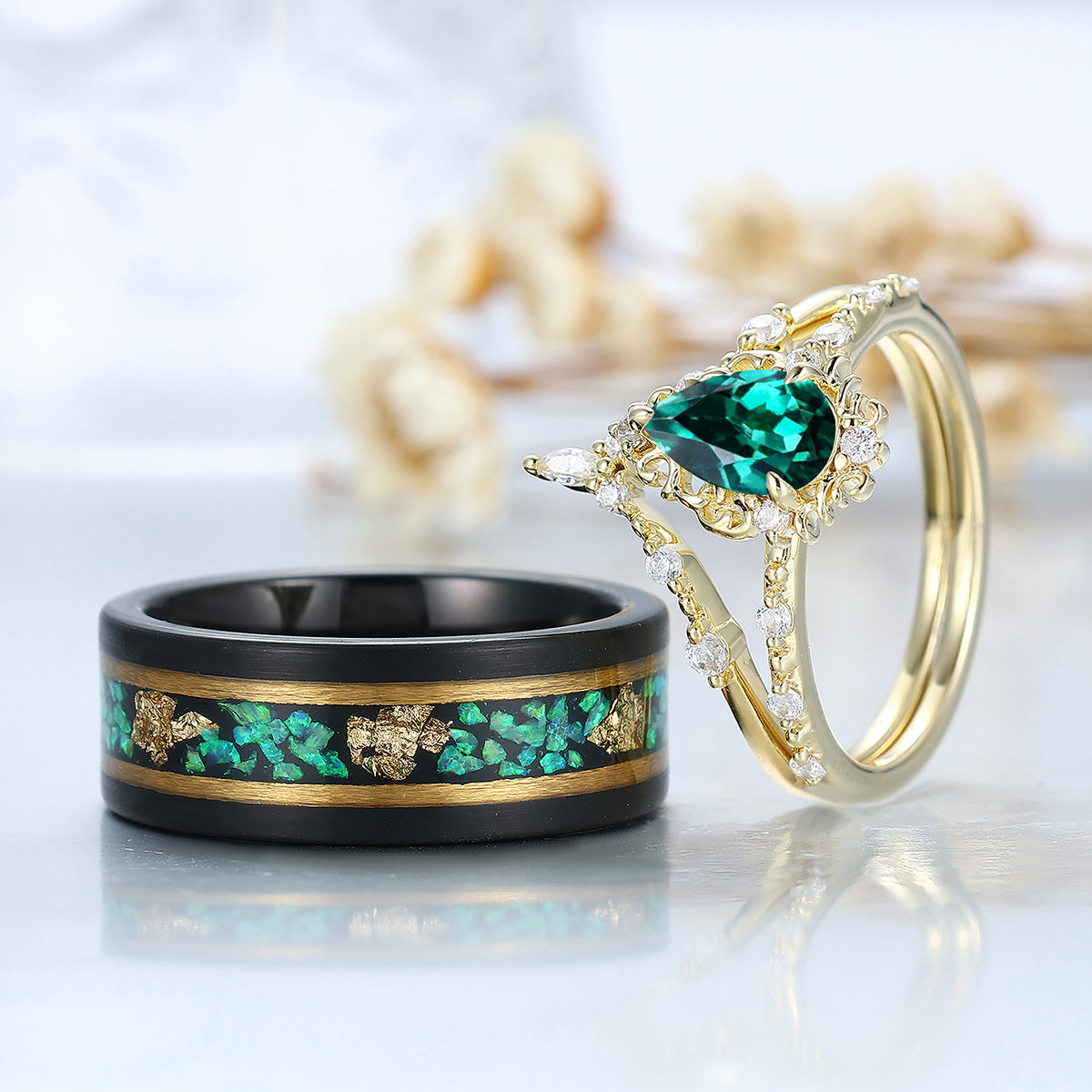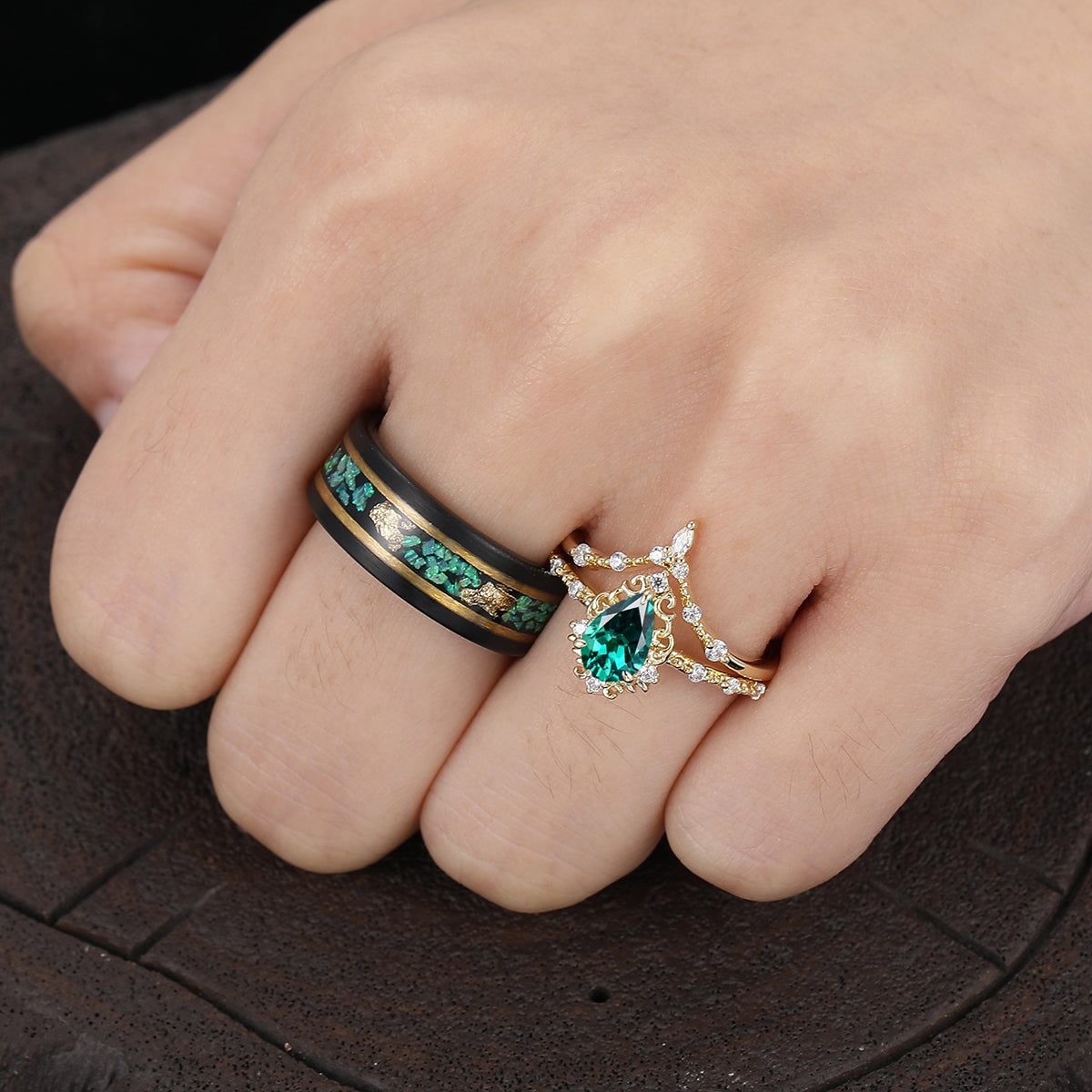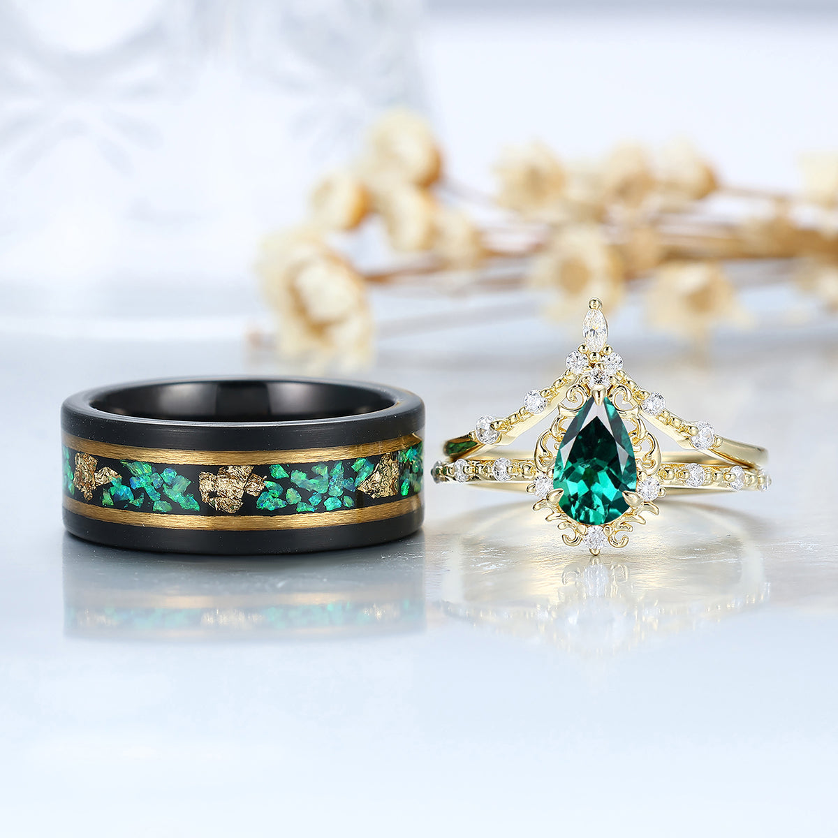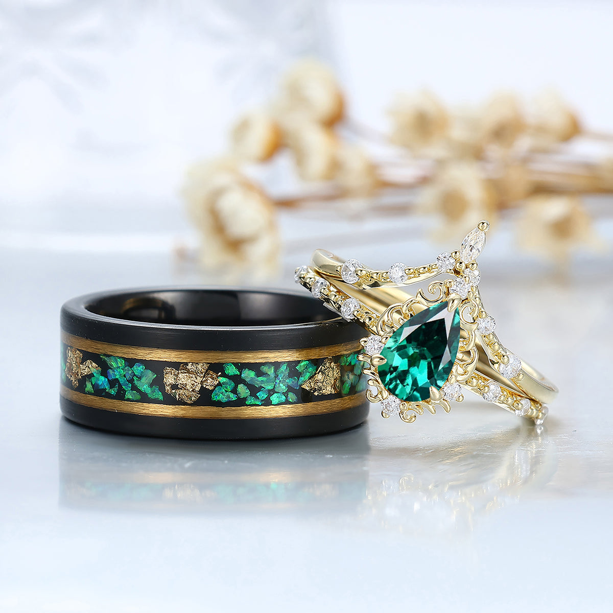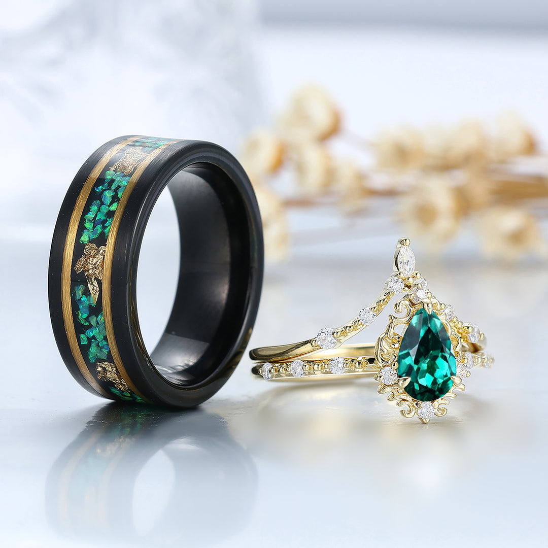 Vintage Pear Cut Green Emerald Couple Ring Set Filigreed Yellow Gold Plated Rings For Him And Her