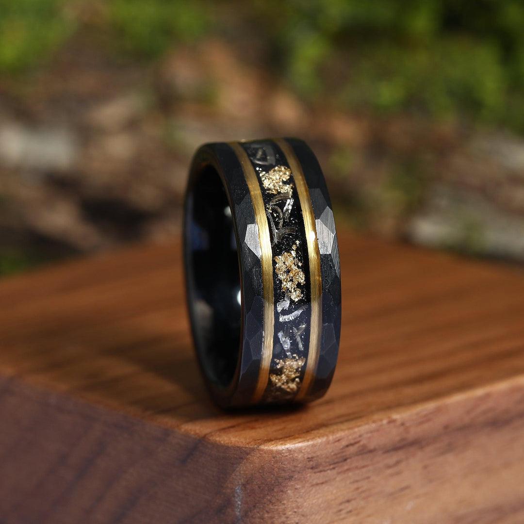 Metal Type: Tungsten Carbide - Crushed Meteorite,Gold Leaf and Two Yellow Gold Lines Inlay - Hypoallergenic